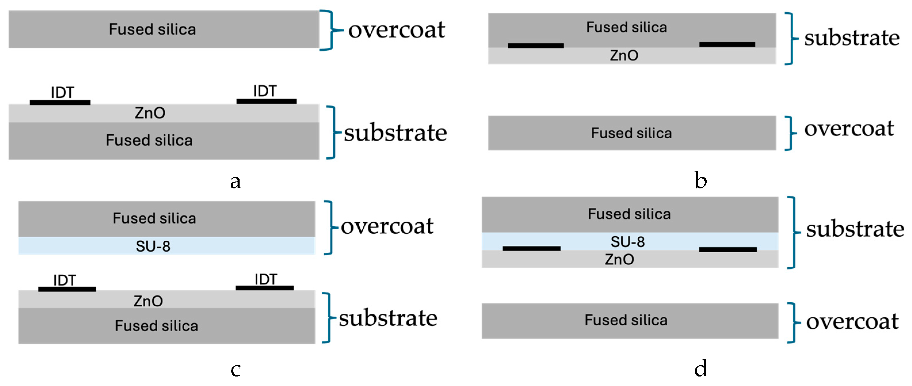 In the present work, we investigate a multilayer structure consisting of a fused silica substrate (500 µm thick) coated with a piezoelectric c-axis-oriented ZnO thin film (4 µm thick) and a fused silica overcoat (500 µm thick), the latter bonded through a thin SU-8 adhesive layer. SU-8 is a negative, epoxy-based photoresist widely used in micro- and nanofabrication for its mechanical stability, chemical resistance, and compatibility with thick-film processing [