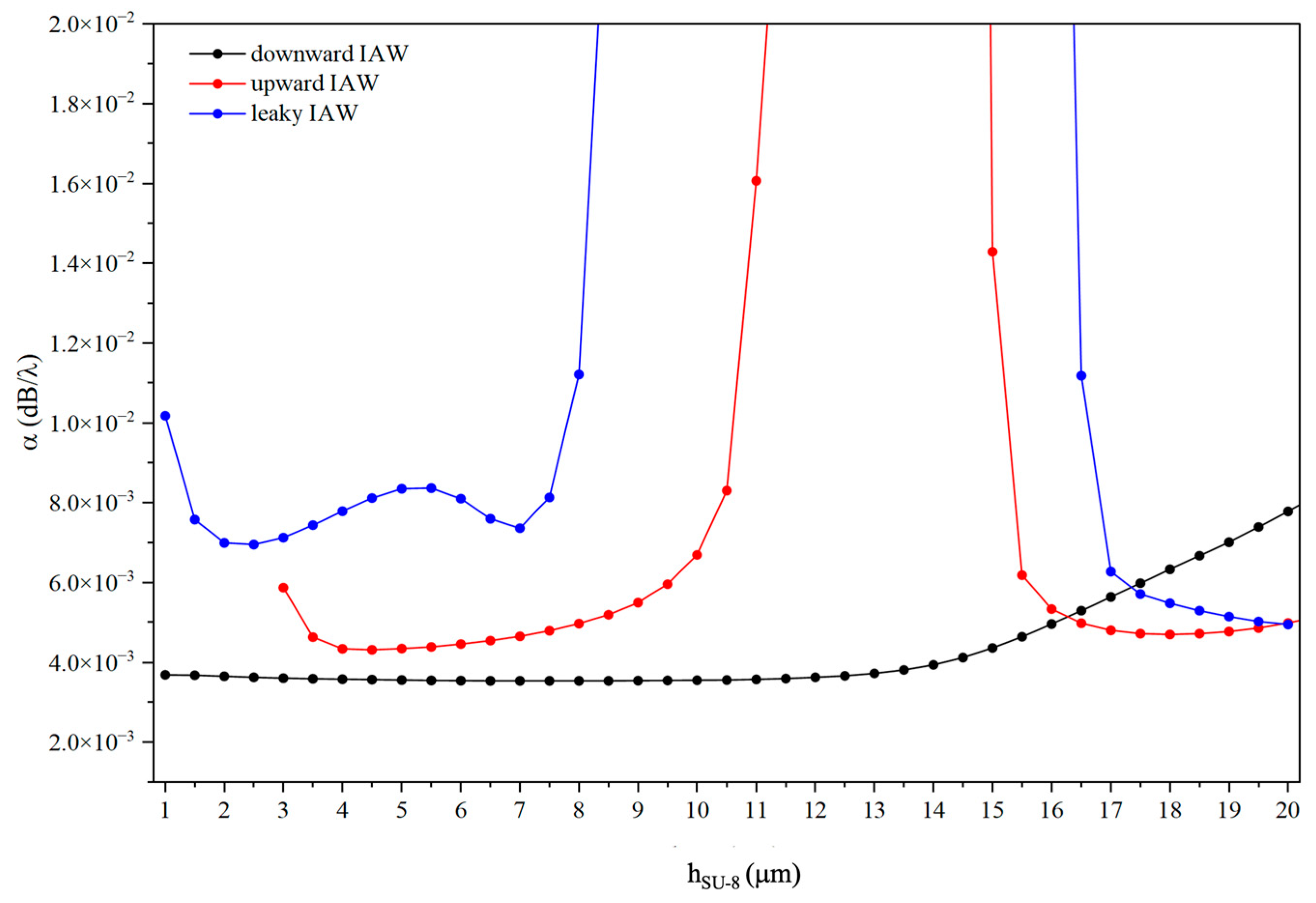 (dB/λ) as a function of the SU-8 thickness for the downward IAW, upward IAW, and leaky IAW modes.