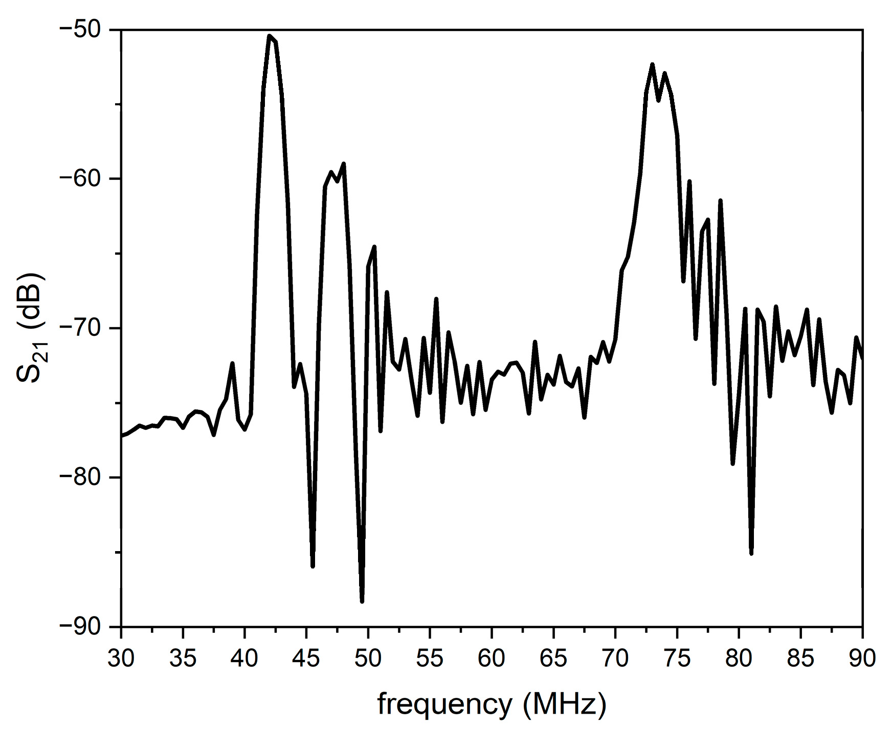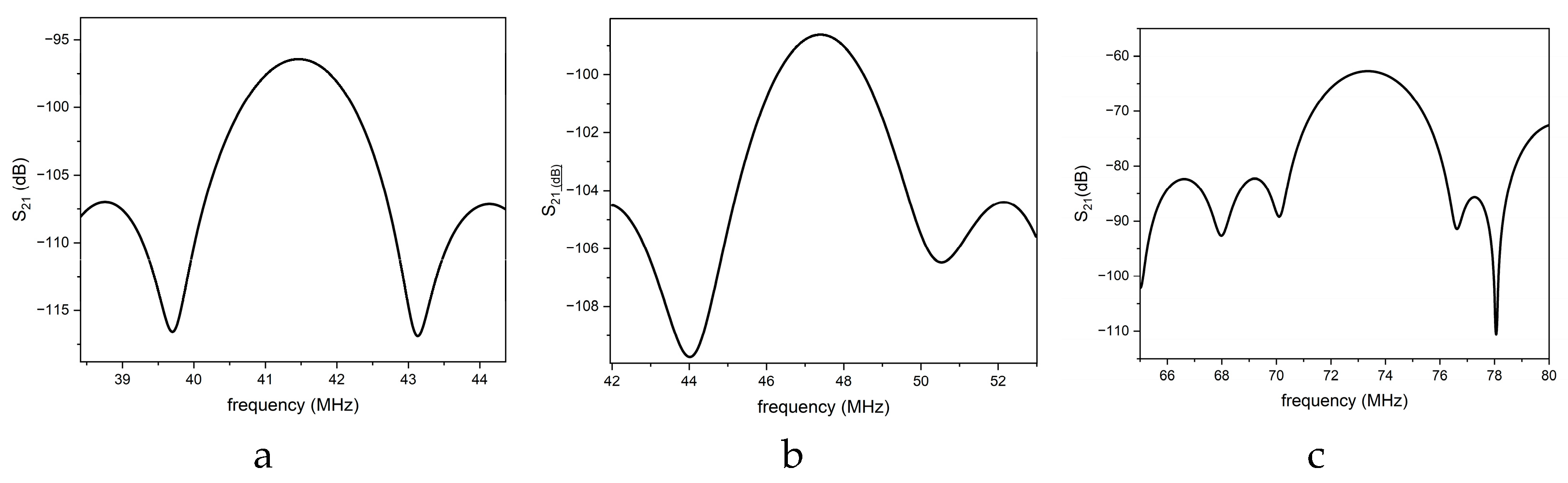 Figure 12a–c were obtained by applying a time-gating procedure to suppress spurious contributions in the time domain response. The gate center was positioned at the maximum of the time response, while the gate span was carefully adjusted to include the full set of sidelobes associated with the acoustic signal of interest. The gated time domain data were subsequently transformed back into the frequency domain through an inverse Fourier transform, yielding an idealized frequency response with reduced parasitic interference. Measurements were performed with the VNA calibrated using a two-port short–open–load–through (SOLT) calibration up to the coaxial cables. This calibration excludes the test fixture, which consists of two SMA connectors mounted on the PCB on which the device was fixed.