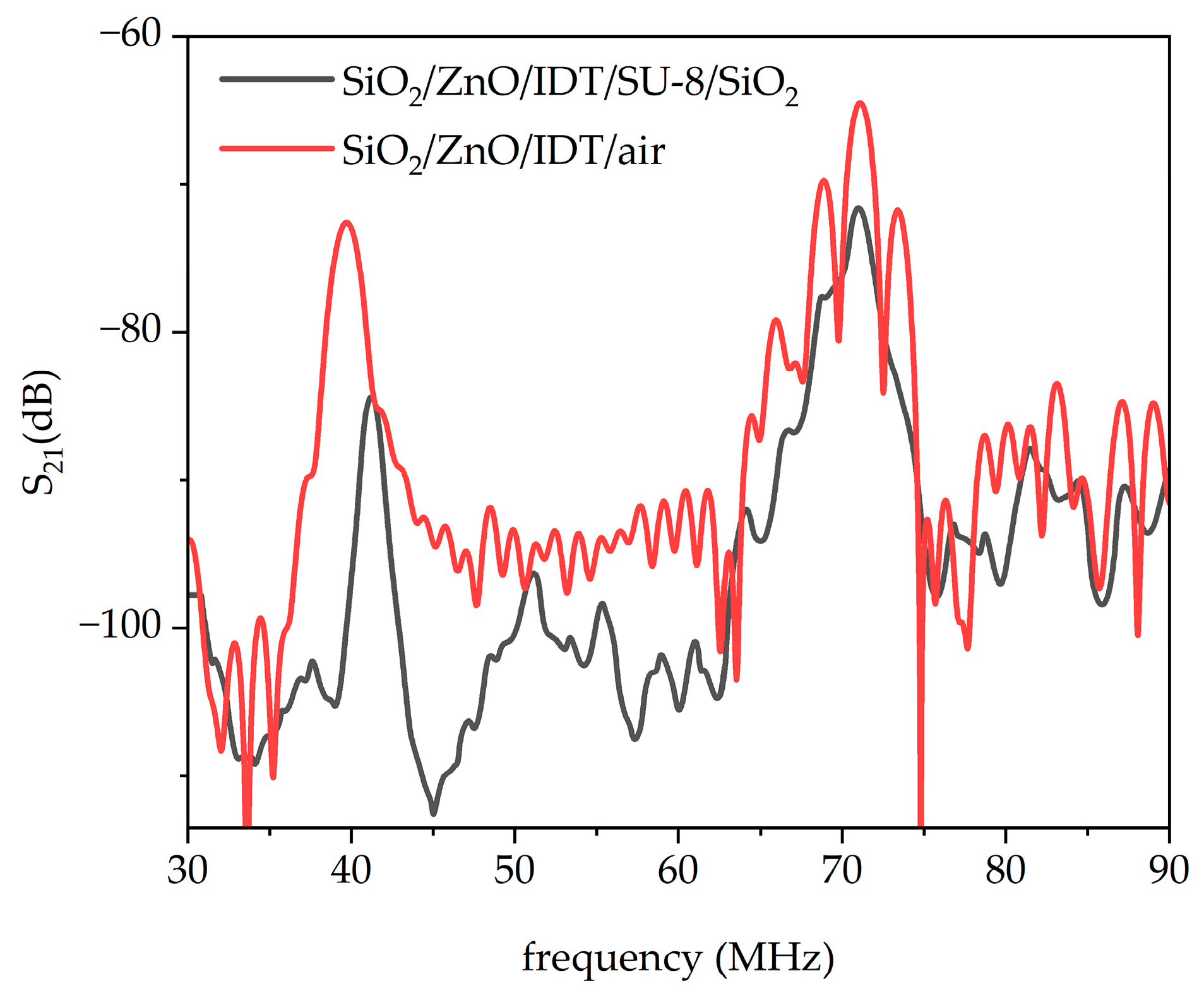 2/ZnO/IDT substrate and subjected to mild pressure and a soft bake at 95 °C to activate SU-8 adhesion and promote solvent evaporation, resulting in a stable adhesive-bonded structure. Since the SU-8 layer was compressed during bonding, its actual thickness is not precisely known; however, based on the manufacturer’s specifications for spin-coating speed versus thickness, and considering the mild pressure applied—which may reduce the film thickness by a few percent—we estimate its final thickness to be approximately 5–6 µm.