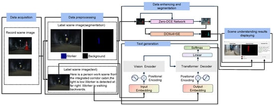 To address the first issue, this paper proposes an object recognition method based on semantic segmentation of low-light-enhanced images. With the segmentation result map, the category and location information of the objects in the image can be obtained to enhance the accuracy of scene understanding. To address the second issue, the visual–linguistic model is fine-tuning on the real underground corridor scene to generate more accurate and complete scene description text. The framework of the whole system is shown in Figure 1.