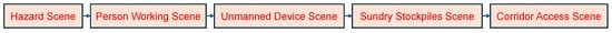 Sections to be populated, including cabin category, scene category, lighting conditions, target and spatial relationships, personnel behavior, and hazard level. Scene categories are determined by the objects within the scene, as shown in Figure 9. The priority of the five scenes decreases from left to right. If any one or more of the following hazards are present—flames, debris, ground seepage, or road surface depressions—the scene is classified as hazardous. If personnel are present, the scene is classified as a personnel work scene. If equipment is present, it is classified as an unmanned device scene. If cardboard boxes are present, it is a sundry stockpiles scene. If traffic cones, construction barriers, fire hydrants, or fire extinguishers are present, it is a corridor access scene. If objects from multiple scene types coexist, the site is designated as a high-priority scene. Personnel actions encompass standing, walking forward (or backward), extinguishing fires, and climbing ladders. If hazards are present, the current scene’s danger level is determined by the distance between hazards and critical objects (workers, flammable materials).
