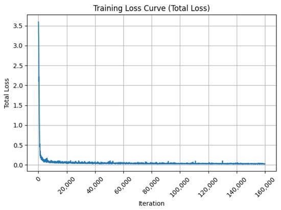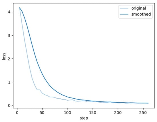 The training loss for this article, fine-tuning and training the visual–linguistic model, is shown in Figure 15. The training loss curve shows that the model fully converges after about 200 steps of iterations, at which point the performance metrics computed with this weight on the test set and the original model on the test set are shown in Table 8.