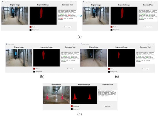 The visualization interface for scene understanding is shown in Figure 16. In the scene understanding visualization interface, the leftmost one is the original image of the current frame, the middle one is the semantic segmentation result of the image, and the rightmost one is the scene understanding text generation result of the image. The figure shows the scene understanding results of the three frames before and after a scene video after frame-splitting. During the scene understanding process of the first image frame, the visual–linguistic model generates wrong text with incorrect locations of the worker in the text, and the wrong text descriptions can be corrected efficiently by utilizing the category and location information of the objects in the image segmentation result map. The colored parts of the scene understanding text are the text parts that are differentiated in the three frames of the image: the red parts are the incorrect text generated by the visual–linguistic model, and the green parts are the correct text. The bottom section displays scene understanding visualizations for different compartments.