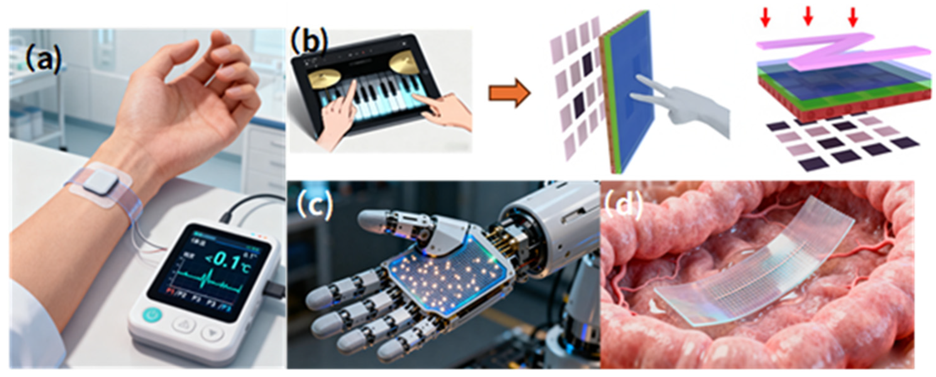 - Niu, C.; Sun, P.; Sima, W.; Fang, Z.; Yuan, T.; Yang, M.; Liu, Q.; Wang, H.; Tang, W.; Xu, J.; et al. Bioinspired lotus leaf microstructure self-healing flexible sensor: Toward dynamic physiological signal monitoring and three-dimensional stress field decoupling. Chem. Eng. J. 2025, 522, 167049. [Google Scholar] [CrossRef]