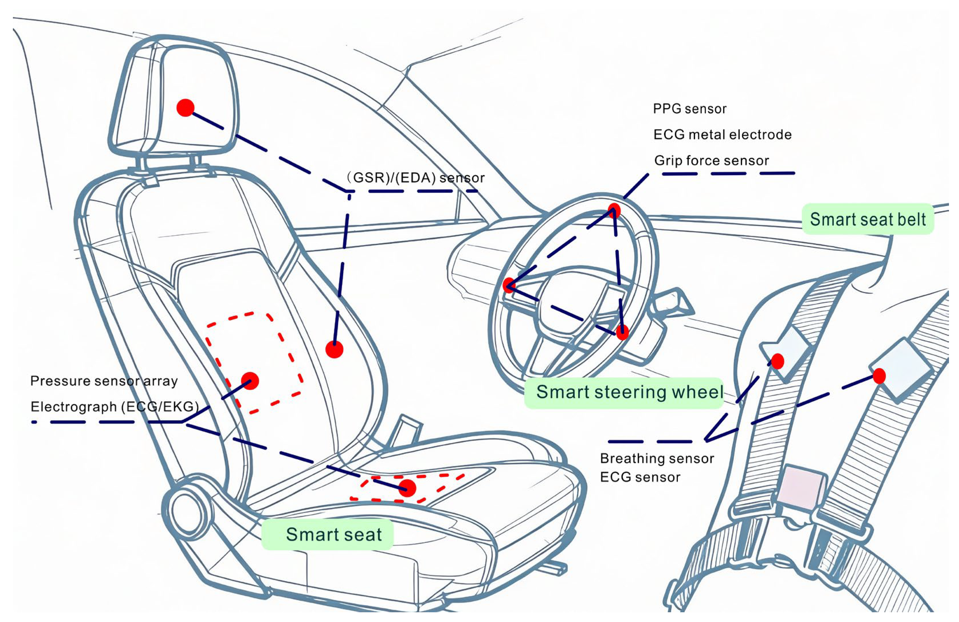 | Seat ECG dry electrode | Heart rate variability data | Medium | High signal stability; enables continuous cardiac activity monitoring; assesses stress levels | Requires continuous contact; clothing obstruction reduces signal quality |