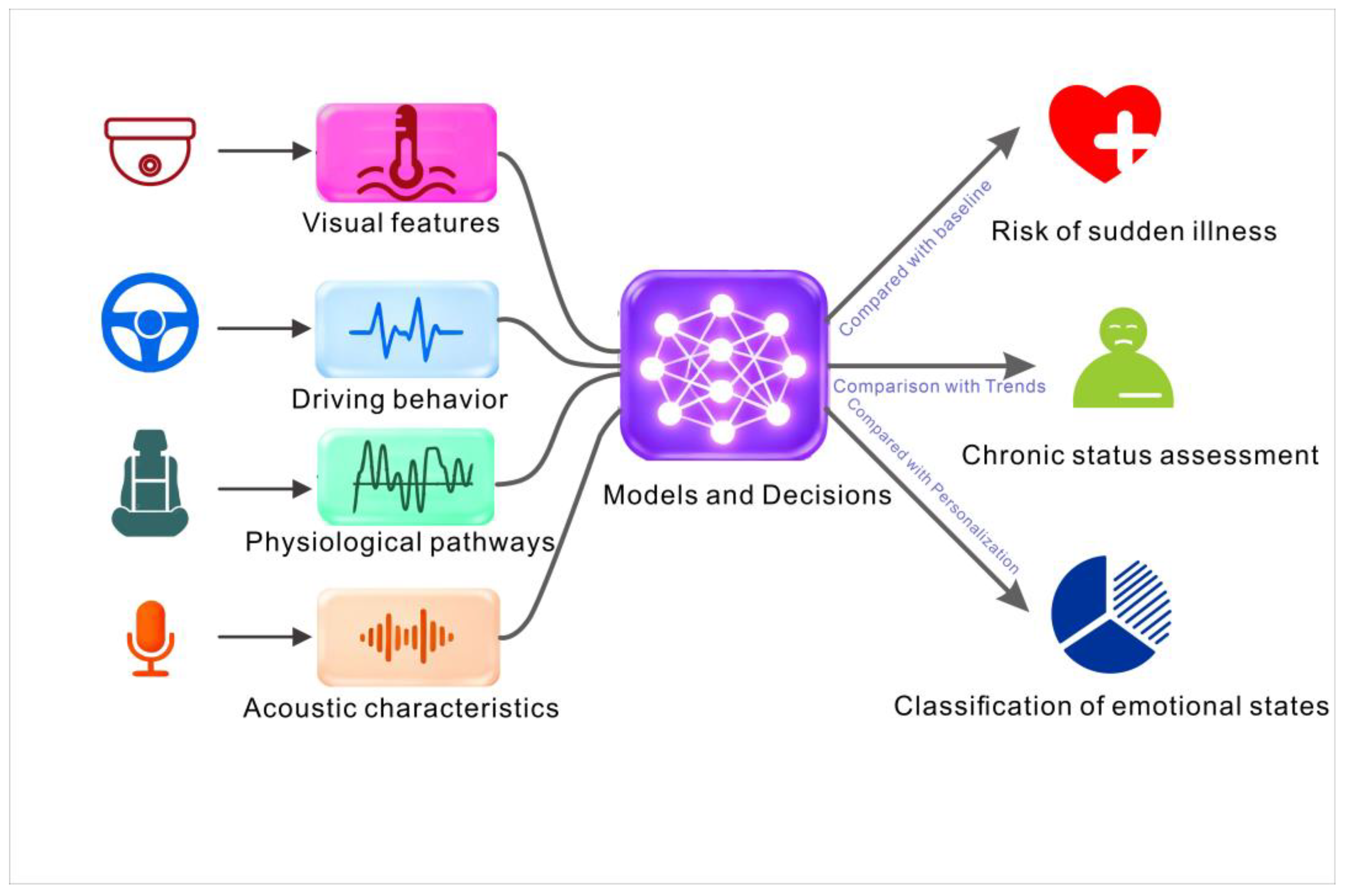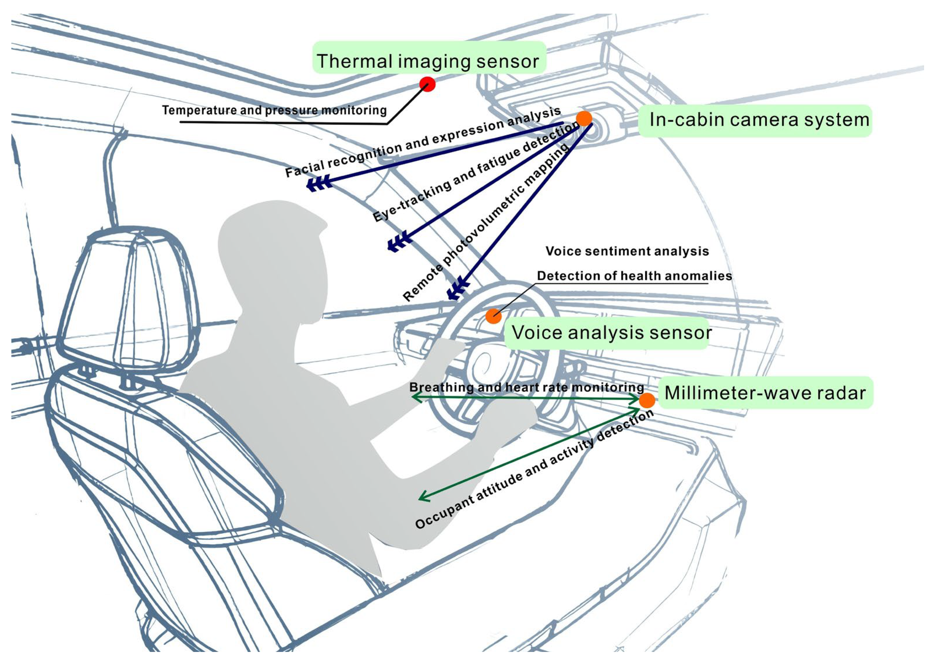 | Sensing and data acquisition | Contact/non-contact sensors | Real-time monitoring of multimodal signals (e.g., driver facial expressions, voice tone, heart rate variability, blood pressure, respiratory rate) | [67] |
