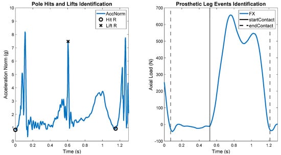 Four event types were identified for each poling cycle in each trial (Figure 3): pole hit, pole lift, the start of foot contact phase and the end of foot contact phase (corresponding to the end of the foot swing phase and its start, respectively). The norm of the acceleration signal from the right wrist’s IMU was used to identify the pole hit and pole lift events as follows. When the pole comes to the ground, a peak in the acceleration norm is observed [36]. A second peak appears in the signal when the wrist is raised to lift the pole [36]. Accordingly, the detection of the hit peaks was conducted using a threshold-based method [36]. Similarly, the lift peak was identified by locating the maximum acceleration norm within a trial-specific frame window, starting from the previously identified hit indices [36].
