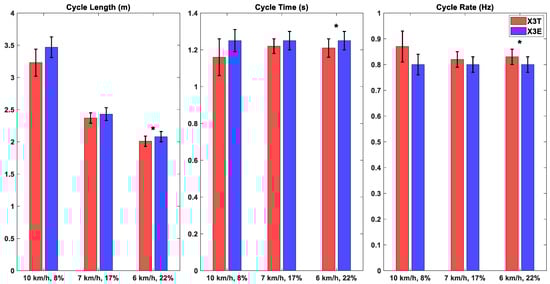 The percentage of the poling cycle spent in the foot contact phase was significantly higher for the X3T than for the X3E combination at all three inclinations (Table 2). The average duration of the poling cycles ranged between 1.16 and 1.25 s for all the trials (Figure 4). The mean cycle rate ranged between 0.80 Hz and 0.87 Hz across all trials. The average cycle length ranged between 2.01 and 3.47 m. At all three inclinations and speed combinations, Genium X3T exhibited the shortest cycle duration. As expected, the cycle time increased as the cycle rate decreased (Figure 4).