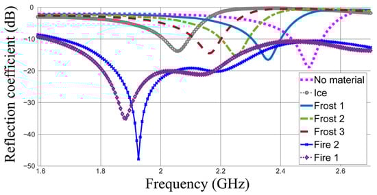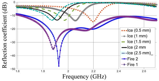 The reflection coefficients for ice thicknesses of 0.5, 1, 1.5, 2 and 2.5 mm are shown in Figure 5. The resonant frequencies at 0.5 and 1 mm thicknesses of ice are always above 2 GHz. However, the resonant frequencies when the ice thickness increases become close to those of fire. Hence, the matching property can be used in addition to the property of resonant frequency. When the resonant frequency falls below 2 GHz and S11 < −20 dB, fire can be detected. It is worth noting that the temperature considered for early detection and alarm purposes in early warning systems is 40 °C.