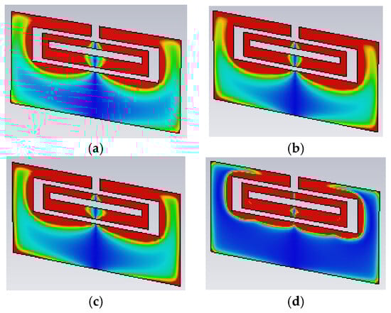 The near electric field of the proposed antenna: (a) without loading, (b) frost 1, (c) ice (1 mm), (d) fire 1. Colors indicate the field strength in ascending order are as follows: Dark blue (weakest), light blue, green, yellow and red (strongest).