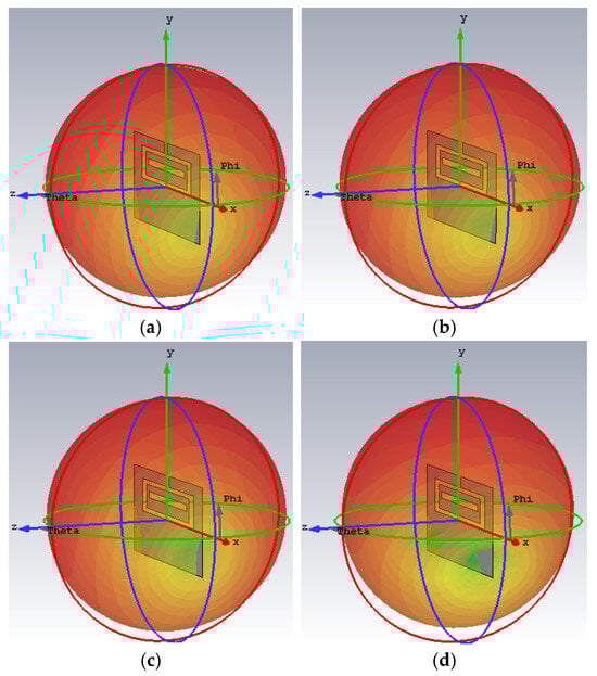 The maximum 3D gain radiation patterns of the proposed antennas at 2.45 GHz for the following cases: (a) without loading, (b) frost 1 (c) ice (1 mm),and (d) fire 1; red: Maximum, yellow: medium and green: minimum.