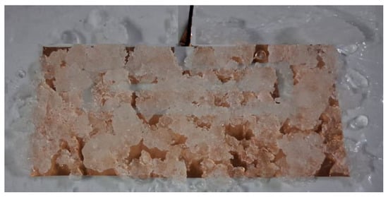 The reflection coefficient (S11) was measured using an Anritsu ShockLine MS46322B two-port vector network analyzer (VNA), (Anritsu Company, Morgan Hill, CA, USA). The instrument has a frequency range from 100 MHz to 43.5 GHz, 130 microseconds per point sweep speed and better than 100 dB dynamic range to 43.5 GHz. It is operated in its standard S-parameter mode [40]. Calibration was performed using a SOLT (Short-Open-Load-Thru) kit; calibration standards were connected directly to the reference plane [41]. All measurements used a 50 Ω system impedance; cables with phase-stable 50 Ω coaxial connectors were used throughout. Additionally, care was taken to ensure that the connector did not contact any part of the material under test, avoiding unintended interactions in the measurements. A thin insulation layer is placed on the antenna surface between the antenna and ice. This is to isolate the ice’s effect from the coaxial cable and radiation from it. This layer is also made of LDPE and has a thickness of 0.1 mm. The proposed antenna loaded with ice for measurements is shown in Figure 9.