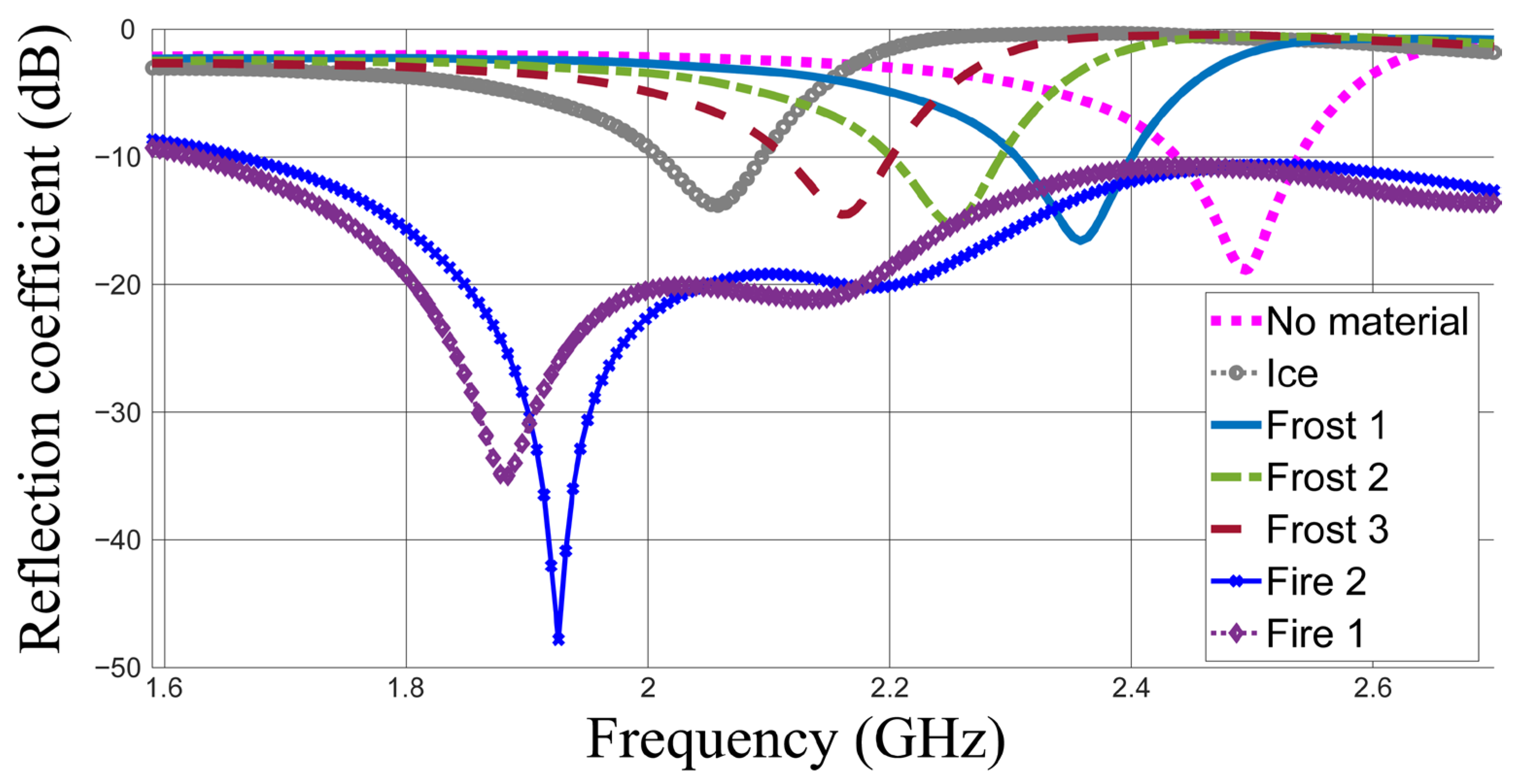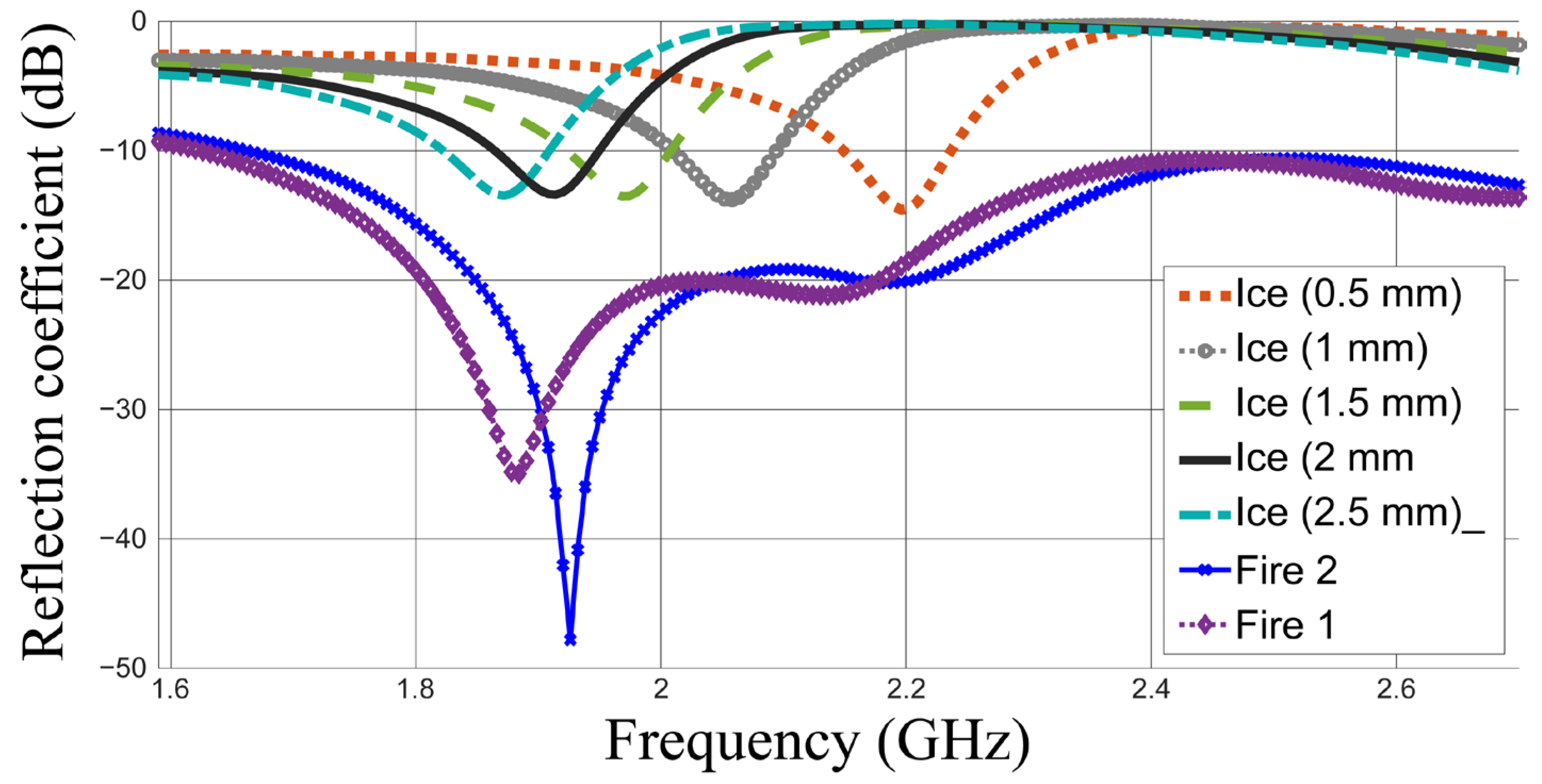 | This work | 2.45 | resonant frequency and matching level | flexible loop | frost: 2.76 ice: 2.72 wildfire: −8.27 | frost, ice and wildfire detection |