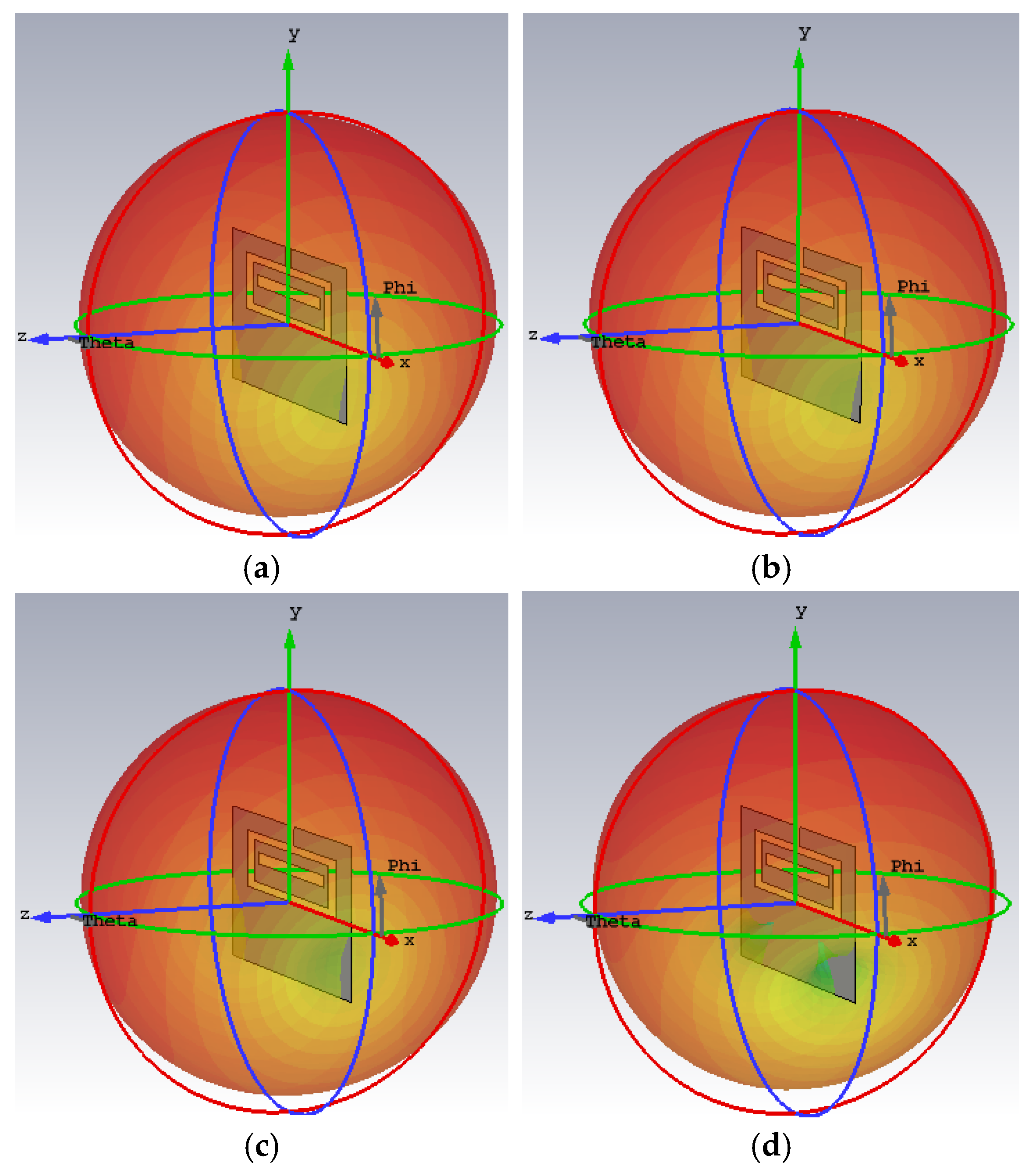 | Case | Resonant Frequency | Gain in the Direction of Maximum Radiation (dBi) | Maximum Radiation Efficiency (%) |