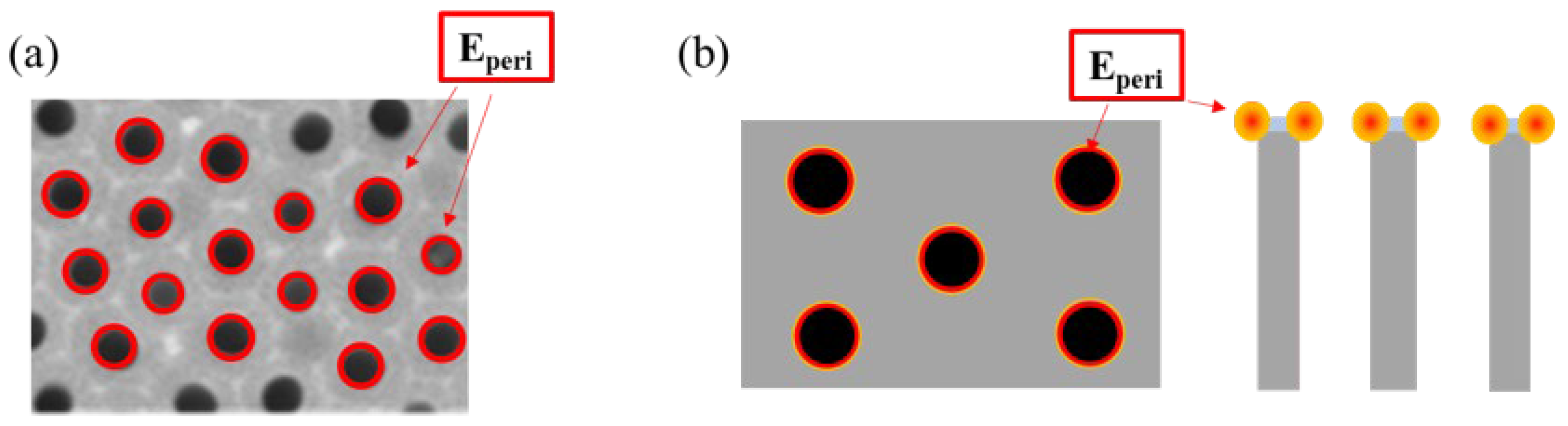 - Yu, C.Y.; Chung, C.K. Novel irregular pore peripheral plasmonic mechanism of nanocomposite metal-nanoporous AAO using new facile one-step anodization and pore widening for high SERS enhancement. Appl. Surf. Sci. 2022, 580, 152252. [Google Scholar] [CrossRef]