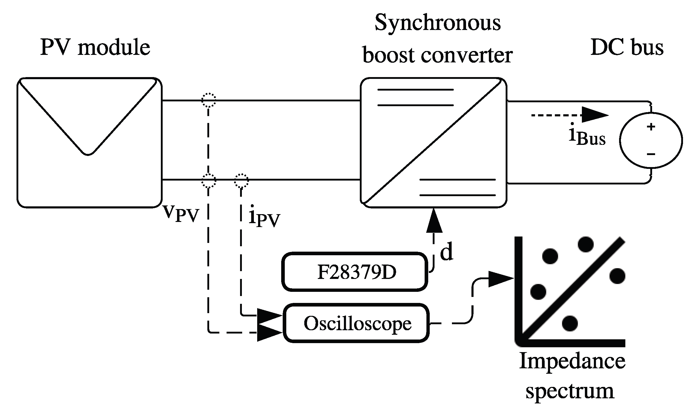 Considering those gaps, this work proposes a methodology for performing IS in PV systems using a power converter, and without external specialized FRA equipment. The approach includes a theoretical analysis of the converter dynamics to derive the duty-cycle amplitude necessary to impose a constant perturbation magnitude across a wide frequency range. Experimental validation was conducted using a synchronous boost converter connected to a PV module, which is controlled with an F28379D digital signal processor (DSP) (Texas Instruments, Dallas, TX, USA) to inject the perturbation signal, while PV voltage and current were measured with an oscilloscope. These data were processed using fast Fourier transform (FFT) analysis to compute the impedance spectrum. The results show strong agreement with commercial FRA-based measurements, validating the proposed method as a low-cost, flexible, and accurate alternative for PV impedance characterization.