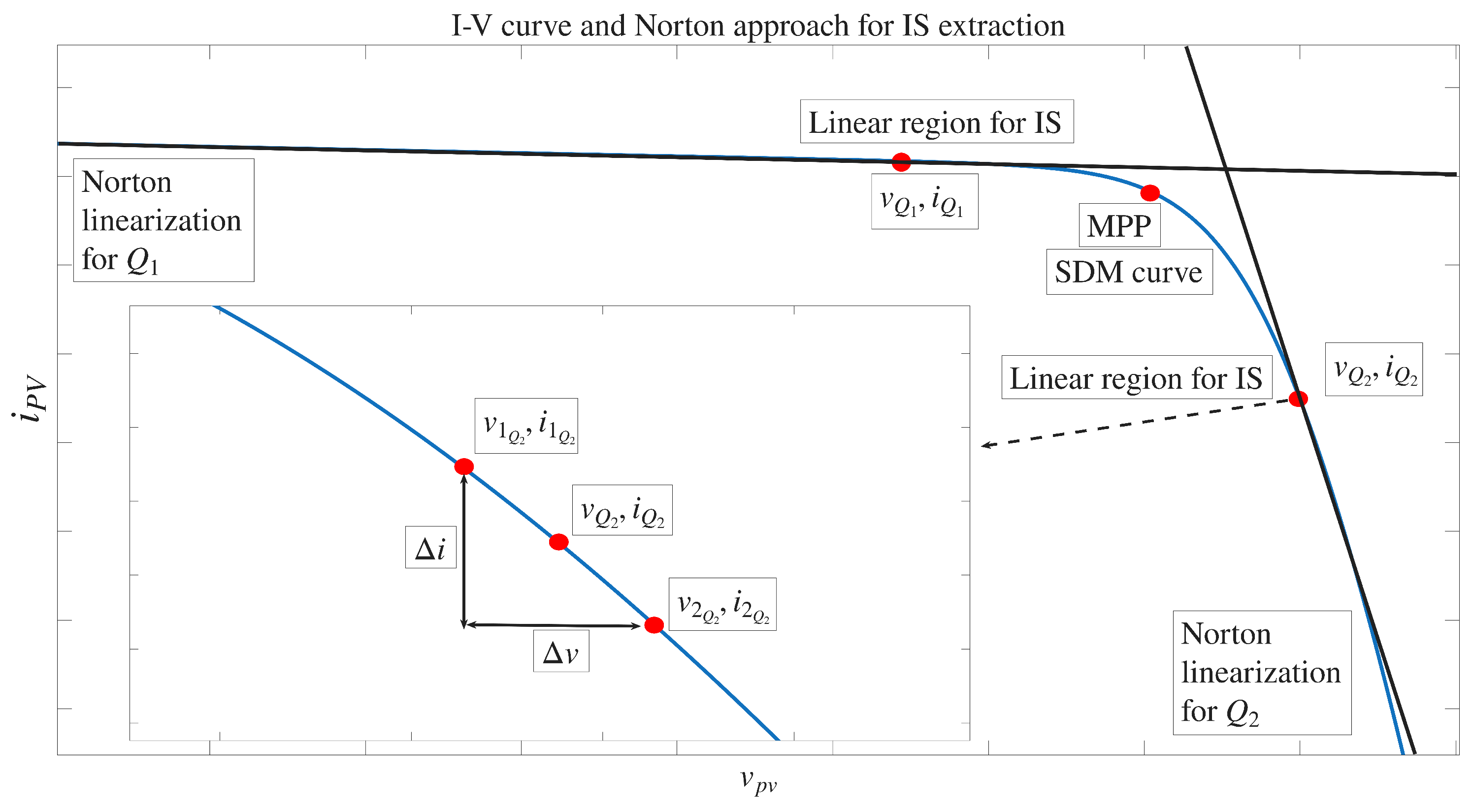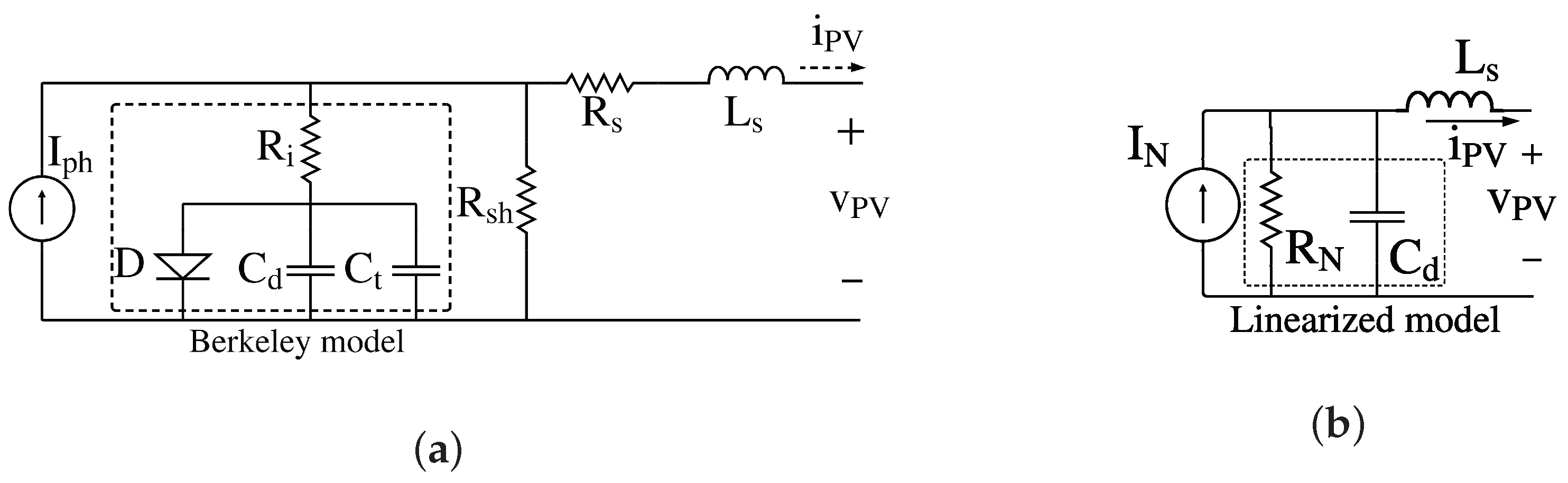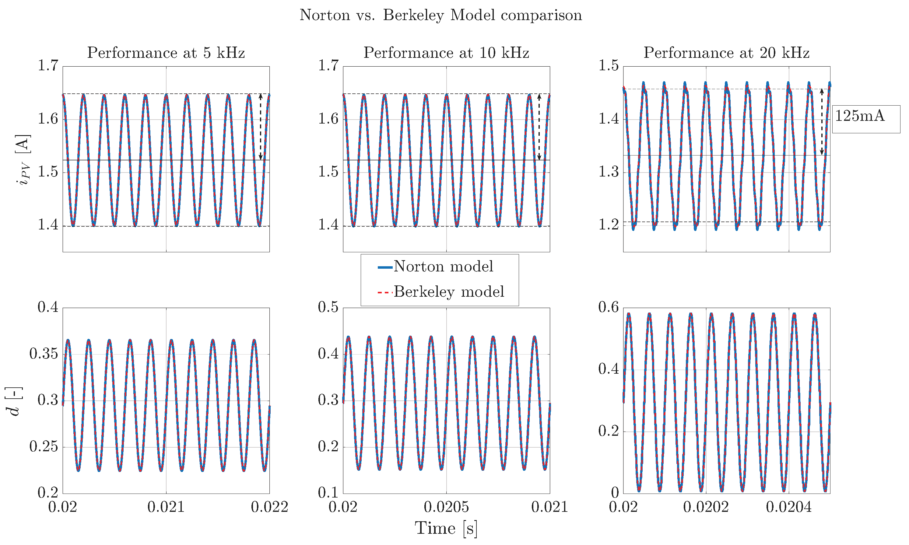 12), which is derived considering the Norton small-signal model. While the Berkeley model is adopted to represent the module’s nonlinear static and dynamic behavior, the perturbation generation is formulated based on the linearized dynamics around the operating point. The validity of the Norton model around a given operation point is confirmed in