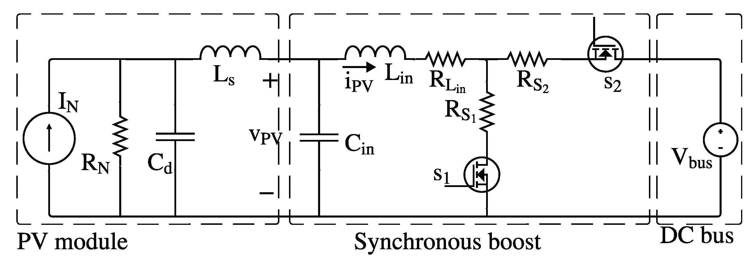 Then, the proposed structure is implemented by connecting the same PV module equivalent circuit to a synchronous Boost converter and a DC bus as it is shown in