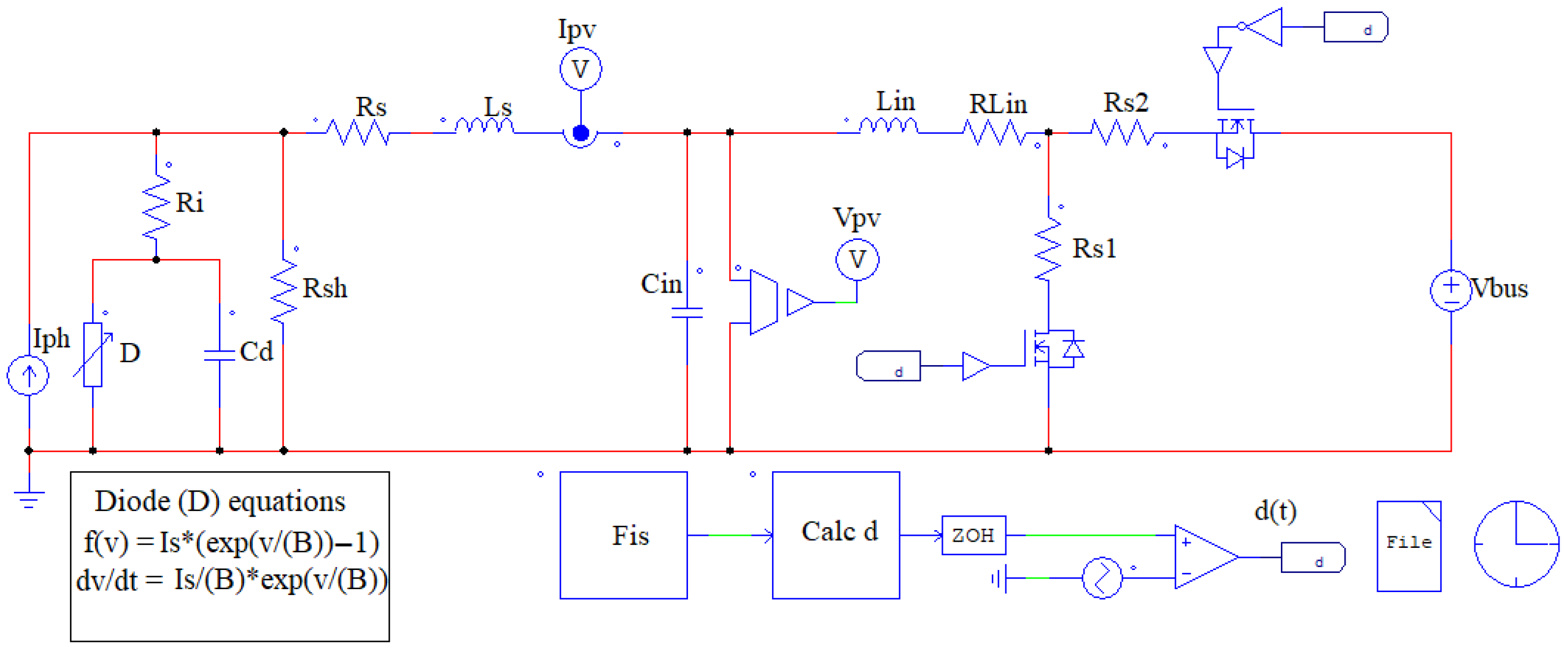 Figure 5 shows the reference IS simulation setup, where the PV module is represented by the SDM with the diode modeled by the Berkeley representation. In this model, the elements