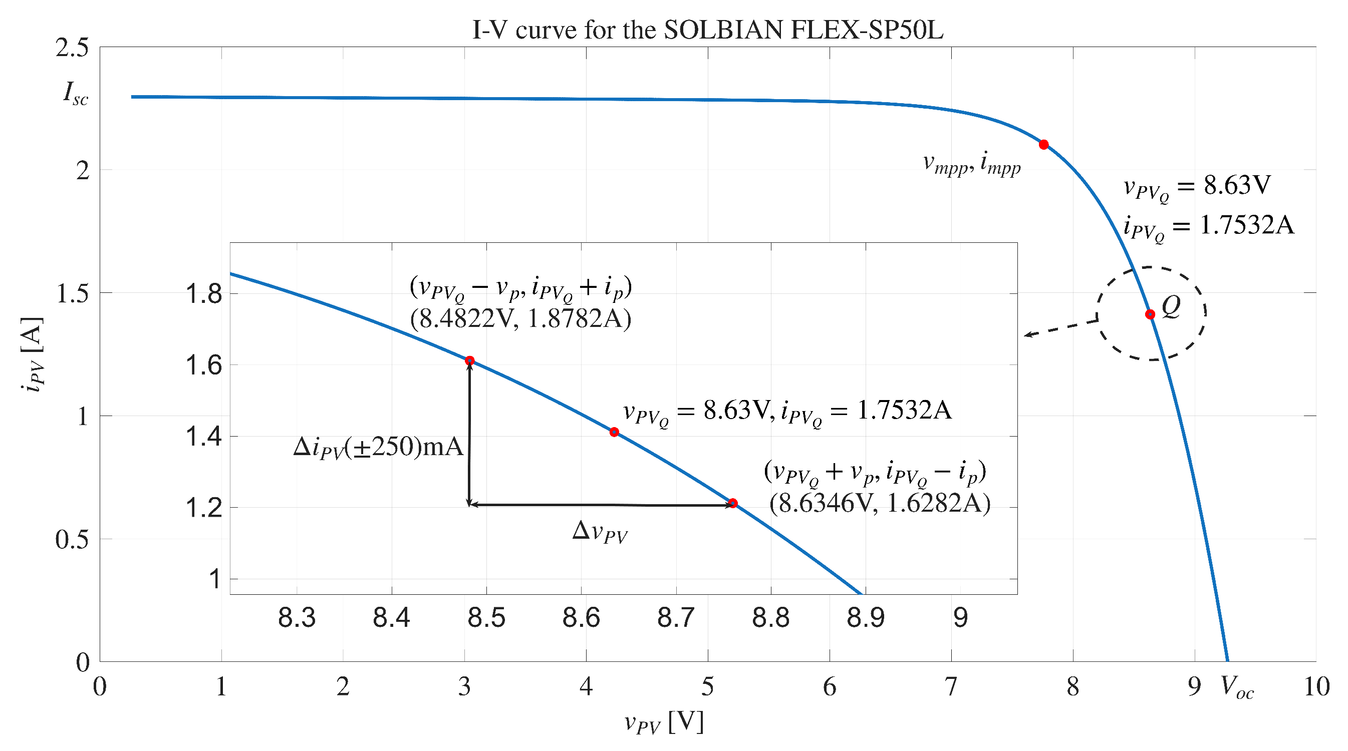 Figure 7 reports the I-V curve of the PV module and the operating point where the IS is measured, which is obtained by performing a voltage sweep at the terminals of the equivalent circuit that models the PV module. This figure also illustrates the amplitude defined for the current disturbance (