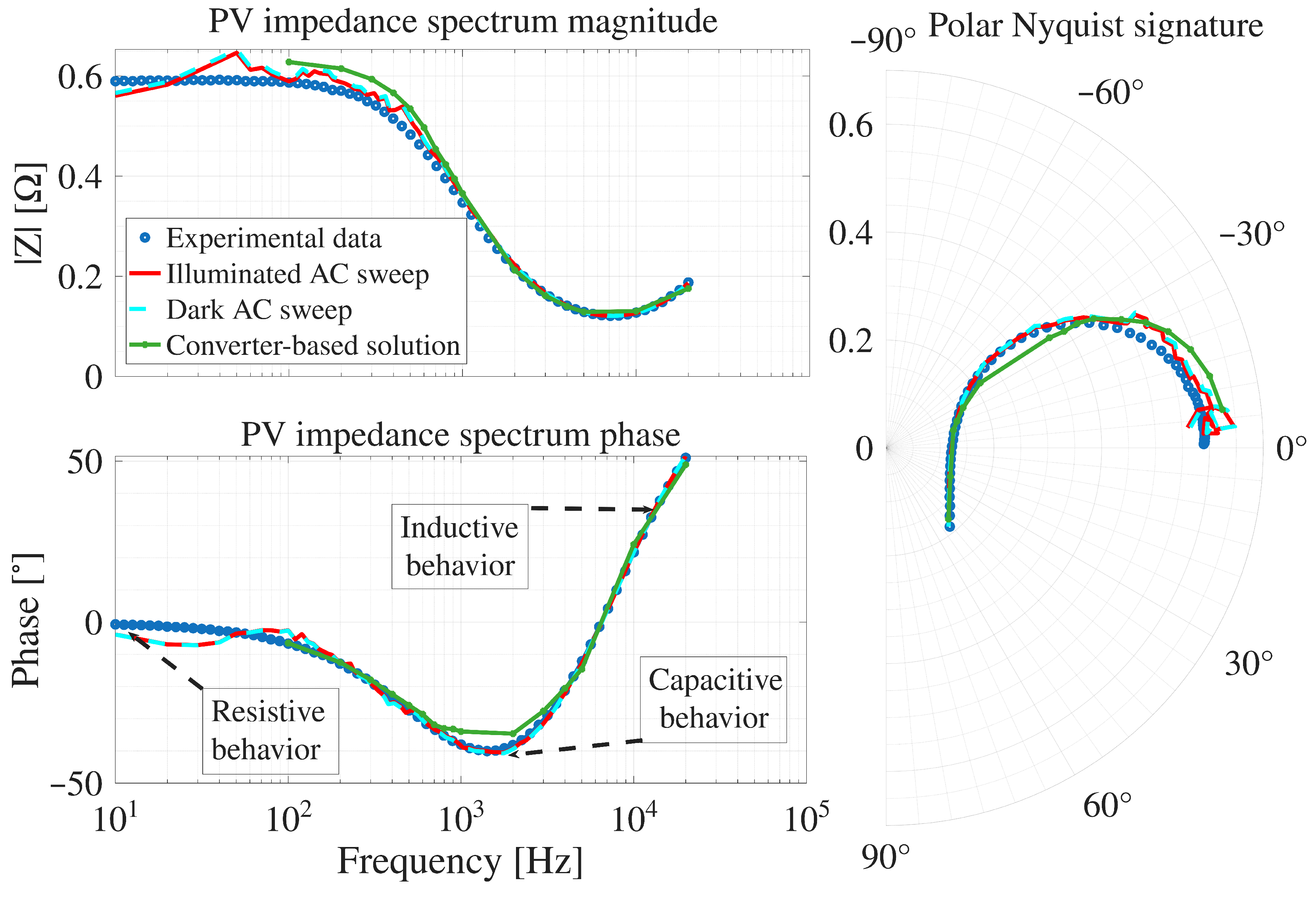 Figure 9. Such a simulation reports the AC-sweep results under both illuminated (red data) and dark conditions (light blue dashed data), which are superimposed because, although the simulated irradiance is different, both simulations are performed at the same operating point, resulting in nearly identical dynamic behavior and IS spectra. The converter-based solution (green data) closely matches the AC-sweep results (red and light blue dashed data), where minor deviations are observed at lower frequencies (