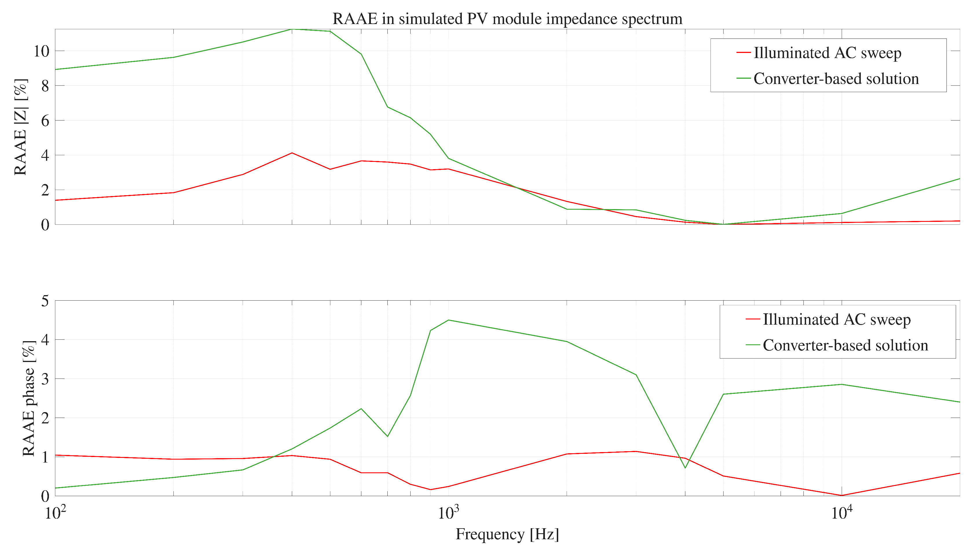 Figure 10. It can be observed that the RAAE corresponding to the simulator AC sweep shows an error lower than 4%; while, the error with the proposed system reaches 11.2% at low frequencies; however, at higher frequencies, the errors are similar. Therefore, the simulation results show that the proposed system is able to reproduce the experimental IS by using the power converter to generate the sinusoidal disturbances.