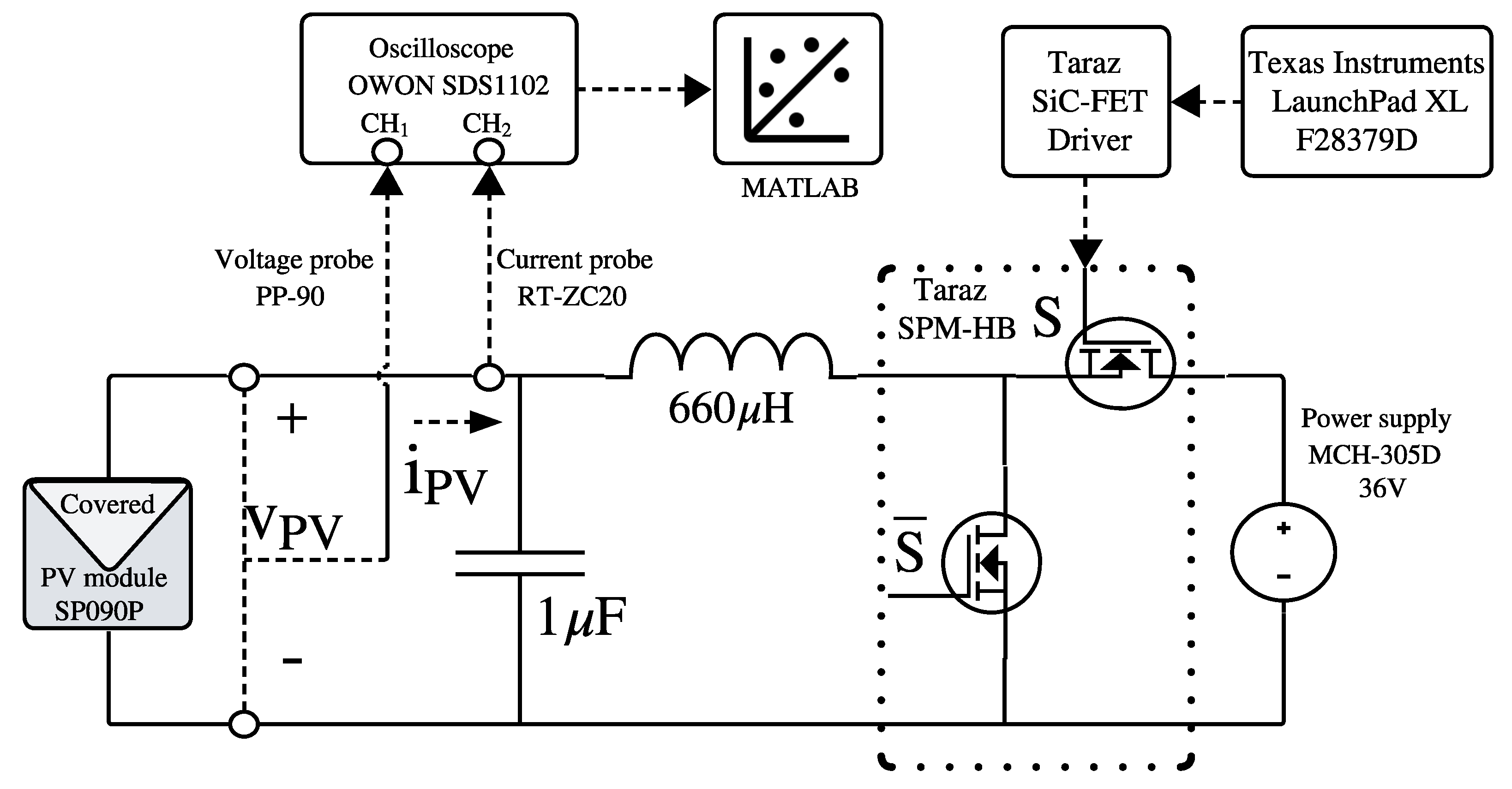 35]. This setup uses the same PV module, current probe (for the oscilloscope), and power supply present in the first experiment. A Texas Instruments F28379D LaunchPad XL microcontroller development kit [