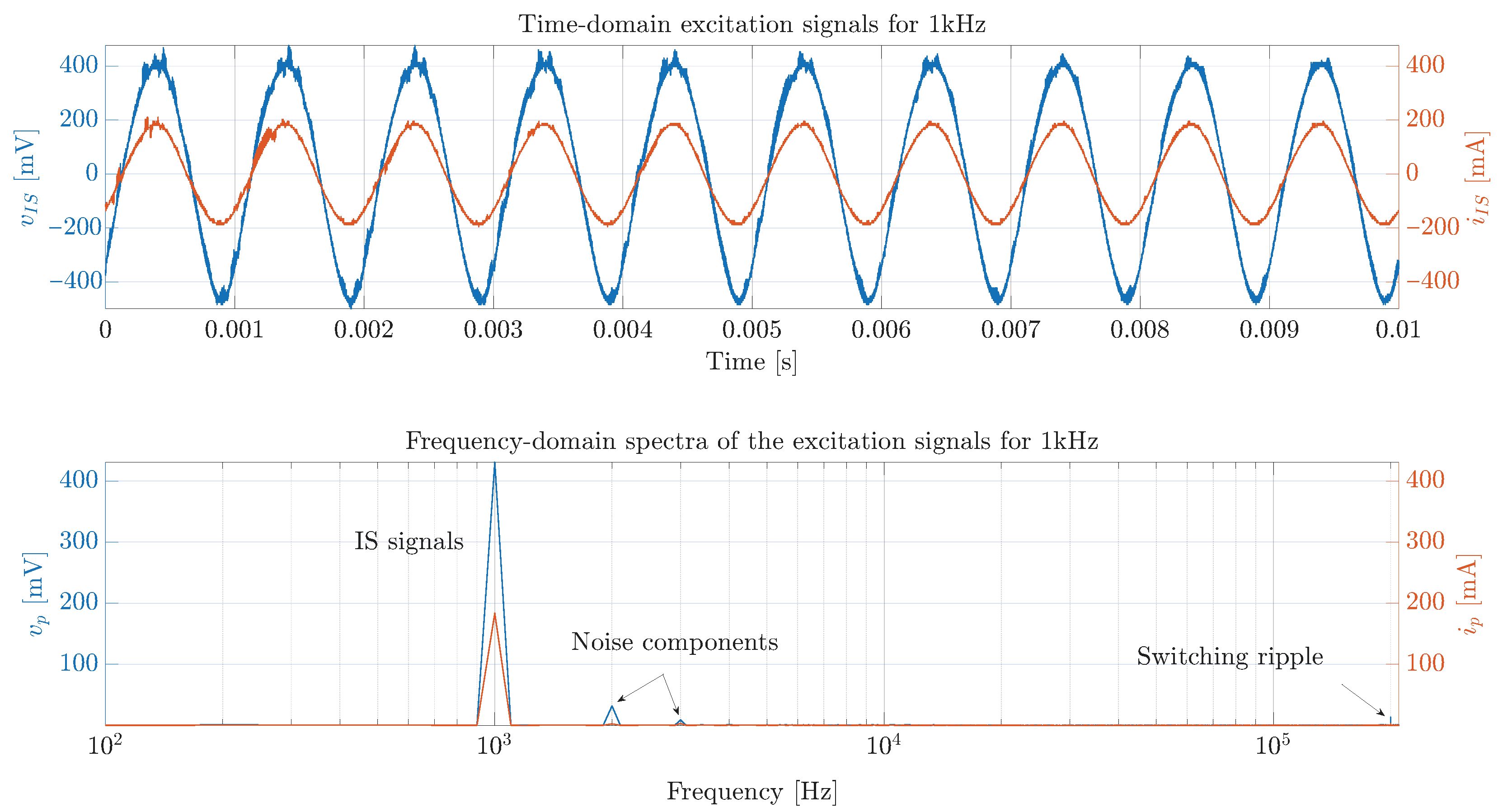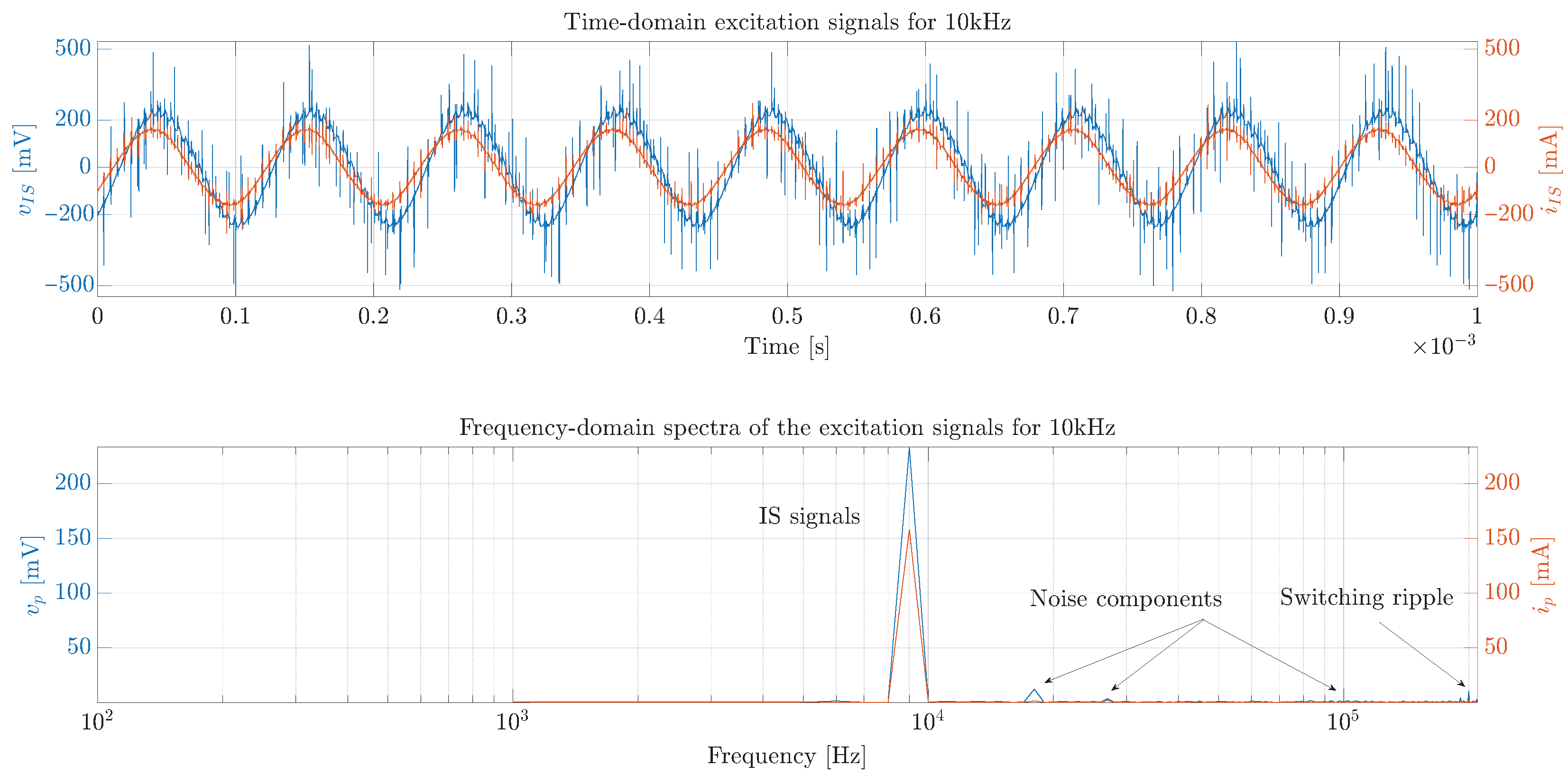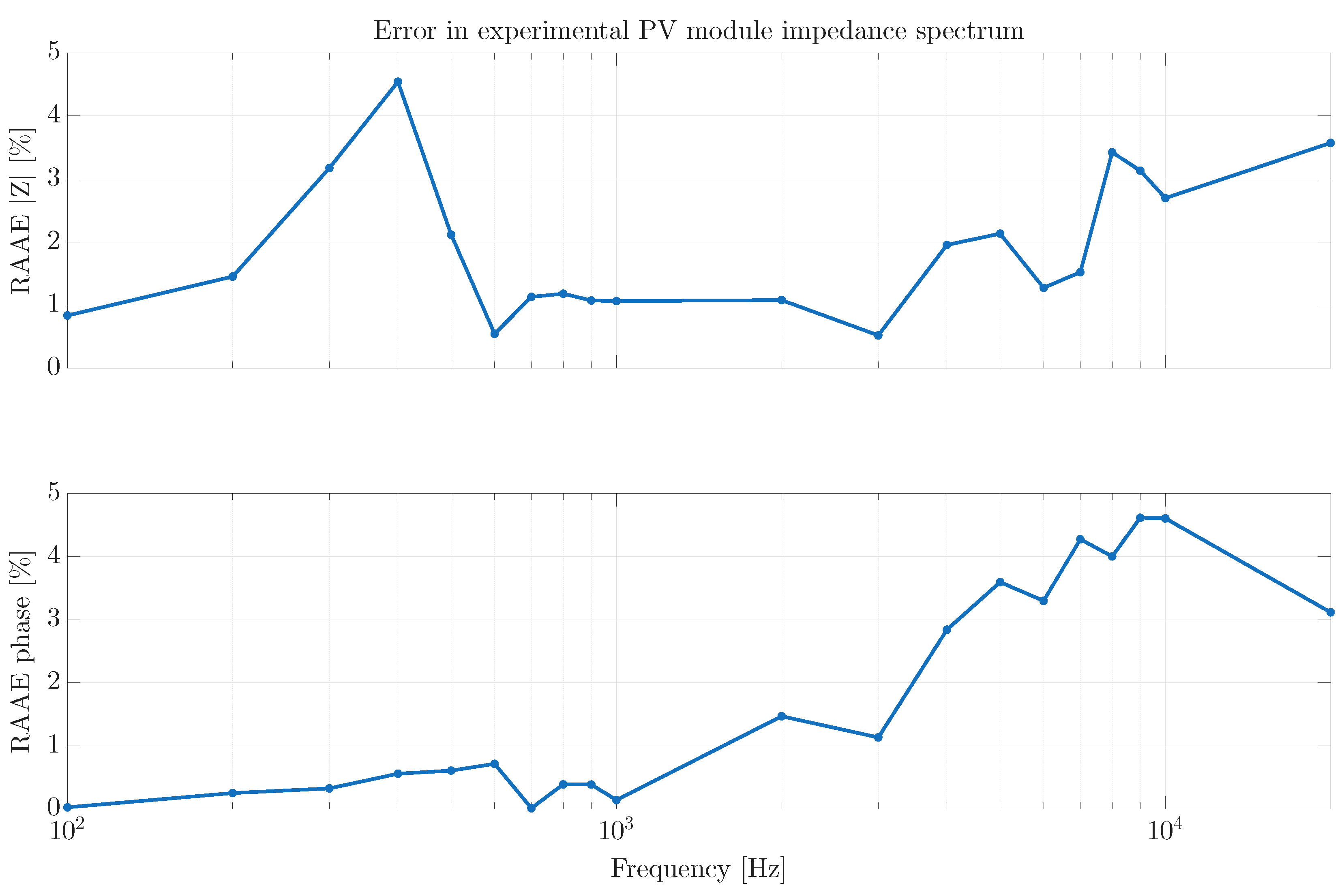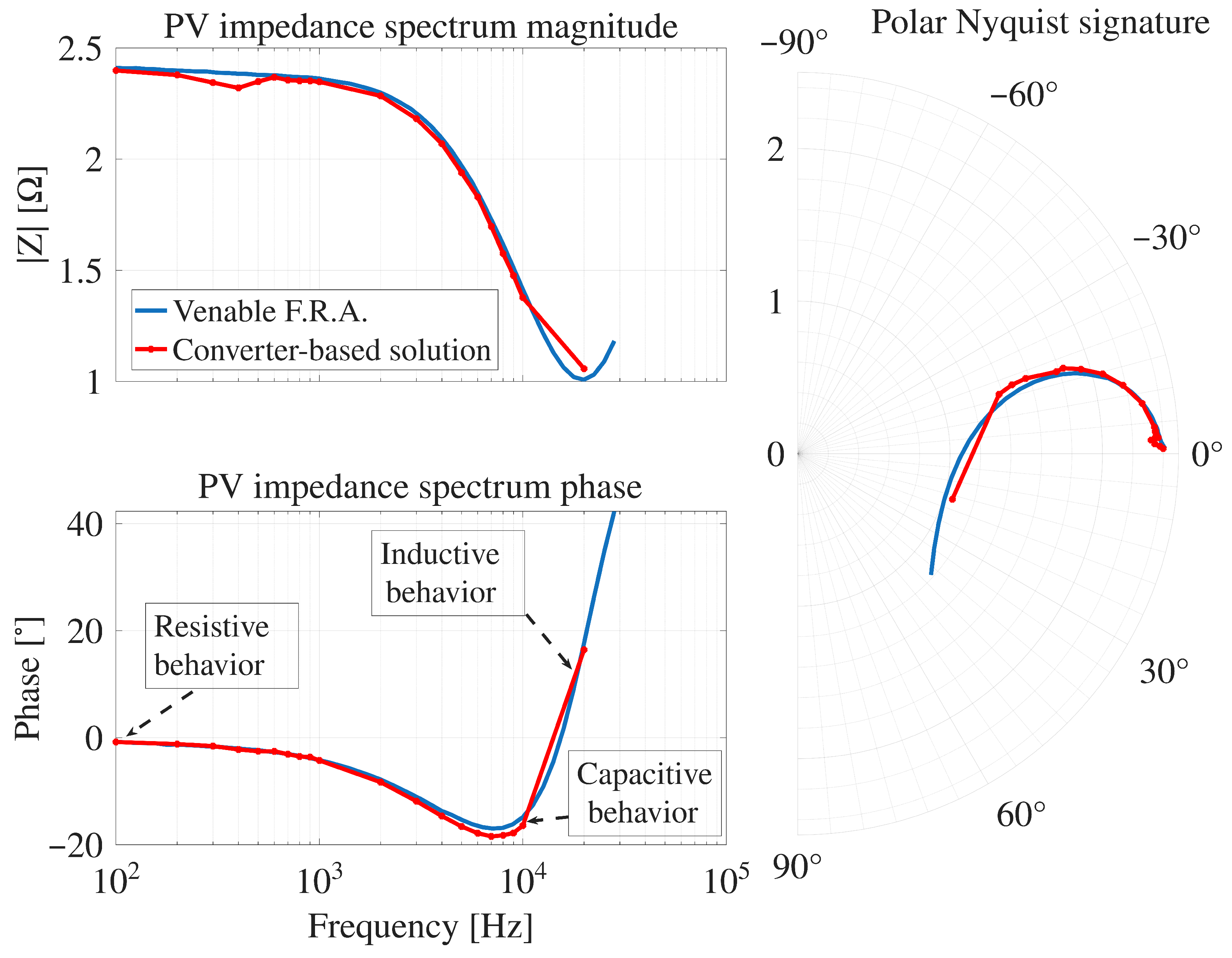 ) was set to 200 mA to ensure a sufficiently high signal-to-noise ratio relative to the electronic noise present in the measurements. The experimental frequency range considered in this test extends from 100 Hz to 20 kHz, which is defined by the limitations of the reference measurement setup and the constraints imposed by the converter-based implementation. The reference system incorporates a high-frequency transformer whose bandwidth confines the measurable impedance spectrum to 30 Hz–250 kHz. Moreover, the proposed power converter operates at a switching frequency of 200 kHz. Then, to maintain adequate separation between the injected perturbation and the switching-related harmonics, the excitation frequency is limited to values below the switching frequency, typically to about one decade lower, i.e., below 20 kHz. At the lower-frequency end, excitation frequencies below 100 Hz are avoided because slow system dynamics can induce variations in the operating point during the measurement due to variations due to variations in the irradiance.