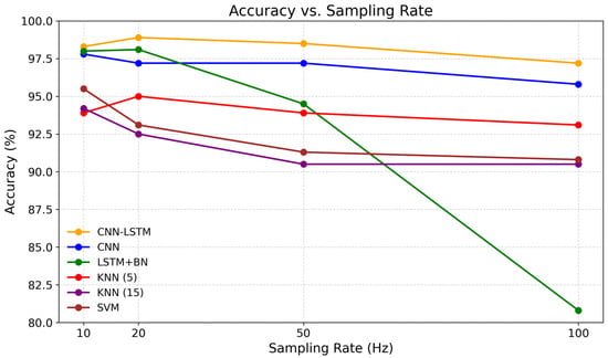 As illustrated in Figure 3, the CNN-LSTM model achieved the highest and most stable performance, peaking at 20 Hz (accuracy = 98.89%, specificity = 99.63%). This result confirms that intermediate sampling rates effectively capture the distinctive motion dynamics of falls while minimizing redundancy and low-frequency noise often associated with ADL. In contrast, the standalone LSTM model showed a pronounced drop in accuracy above 50 Hz, suggesting that excessive temporal resolution may interfere with the preservation of sequential dependencies while unnecessarily increasing model complexity and the number of trainable parameters. Meanwhile, classical approaches such as KNN and SVM exhibited limited adaptability, with noticeable degradation at 100 Hz.