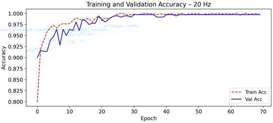 Evolution of the training and validation accuracy of CNN-LSTM model at 20 Hz as a function of the number of epochs during training.