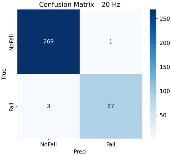 These results yield a precision (PPV) and negative predictive value of ≈98.9%, with an F1-score of 97.8%, confirming the strong discriminative capability of the CNN-LSTM model. The low false-alarm rate is particularly relevant in remote-monitoring scenarios, where excessive false positives can cause caregiver alert fatigue [53]. Overall, the empirical optimum at ≈20 Hz aligns with previous studies and represents the best trade-off between accuracy and energy efficiency for IoT-based wearable fall-detection systems [25,54,55].