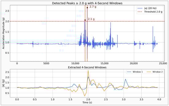 The FARSEEING dataset [36], developed by the European consortium of the same name, comprises more than 200 real falls recorded between 2012 and 2015 in older adults during daily life activities. The sensors, one triaxial accelerometer positioned on the subject’s lower back or thigh, operated at sampling rates of 20 Hz or 100 Hz. Figure 7 illustrates one of the movements from the FARSEEING dataset, highlighting the detected peaks and the corresponding 4 s windows that were extracted based on those peaks to test the model. Following this procedure on 22 extended recordings, 104 four-second windows with accelerations equal to or above 2 g were extracted. Due to missing timestamps, the absolute maximum peak per recording was labeled as the fall, whereas secondary peaks were treated as ADLs. These samples were analyzed using the CNN-LSTM model with a probabilistic threshold of p > 0.4. The model correctly detected 18 of the 22 real falls (sensitivity = 81.8%), produced three false detections, and correctly classified 79 of 82 non-fall windows, achieving an overall accuracy of 93.3% and a specificity of 96.3%. The false alarms corresponded to abrupt but non-fall movements, whereas the missed events involved lower-amplitude acceleration patterns.