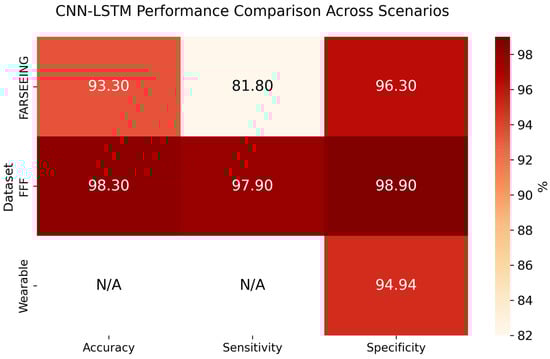 As shown in Figure 8, the CNN-LSTM model preserved stable and consistent performance across all validation scenarios. The comparison among FARSEEING, FFF, and wearable evaluations highlights its robustness to variations in data acquisition and its reliability under continuous monitoring conditions.