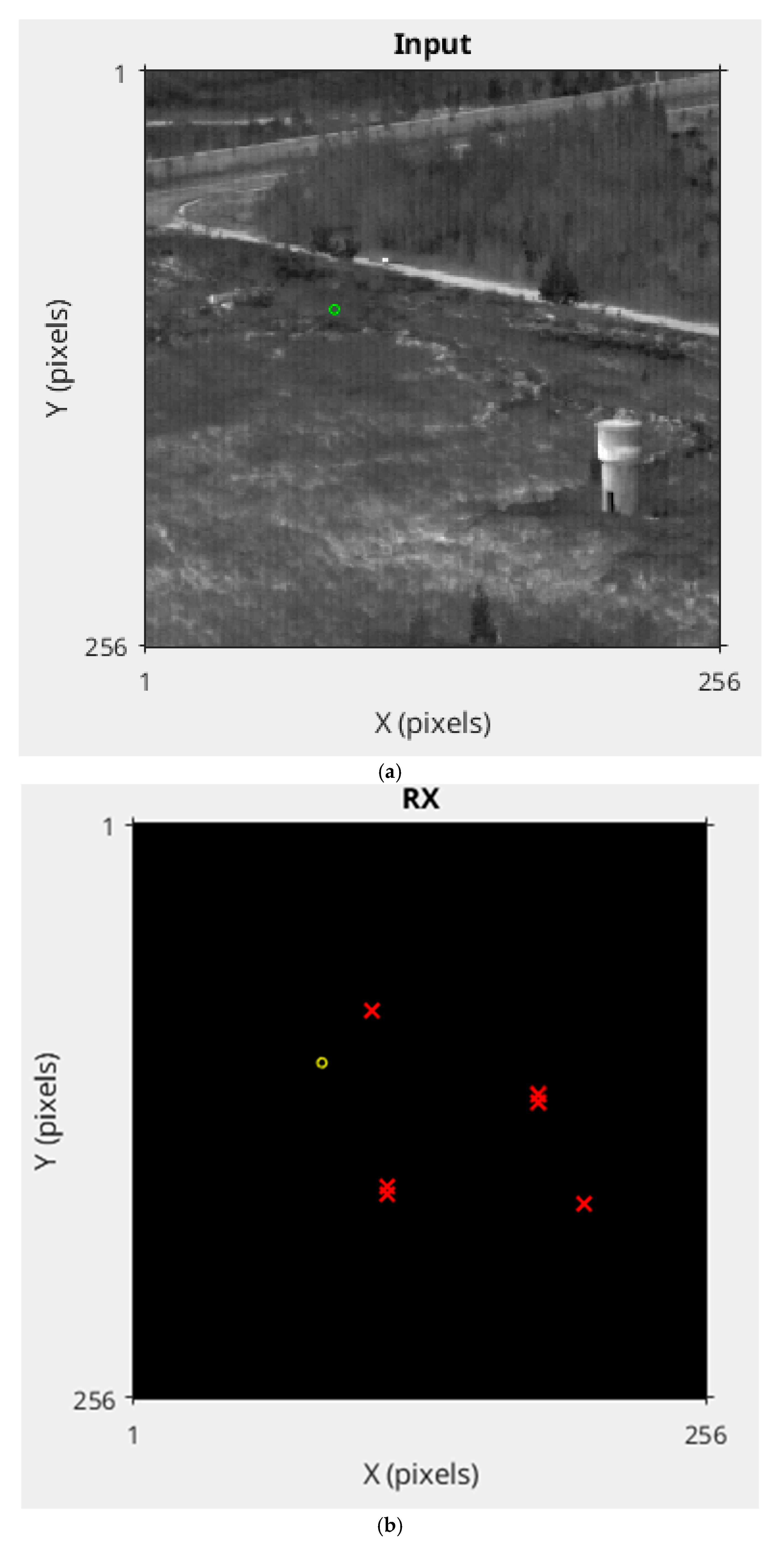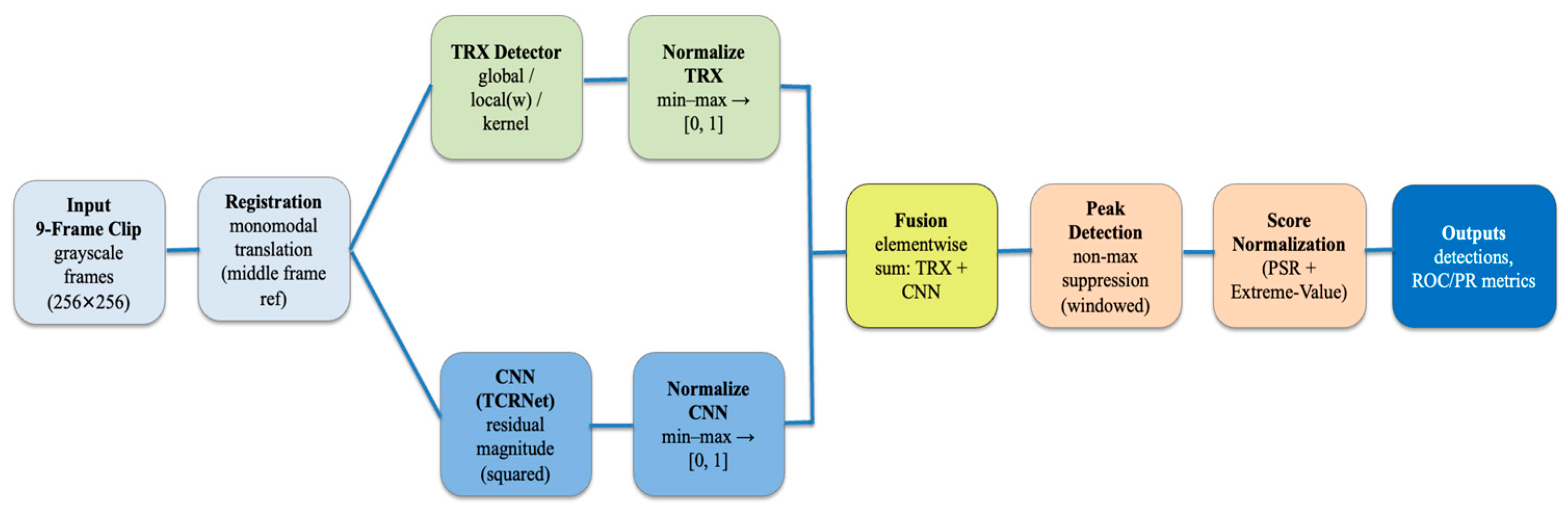 Figure 5 illustrates example outputs from the pipeline, demonstrating the parallelism and fusion process. Specifically, the input image (a) is processed independently and in parallel by the TRX detector and TCRNet, producing anomaly maps (b) and confidence maps (c), respectively. In this example, the TRX output in (b) identifies the correct targets as a temporal anomaly along with three false alarms due to low SNR and background clutter. Similarly, the TCRNet output in (c) detects the correct target using spatio-temporal features while also finding three false alarms due to hard negatives like environmental artifacts. These parallel outputs are then normalized and additively fused to create the combined map (d). This enhances the true target peak, while attenuating the false alarm scores and thereby reducing the number of false alarms to two. This fusion exploits the strengths of both modules: TRX’s unsupervised sensitivity to motion outliers complements TCRNet’s supervised clutter rejection, resulting in improved localization and fewer spurious detections overall.
