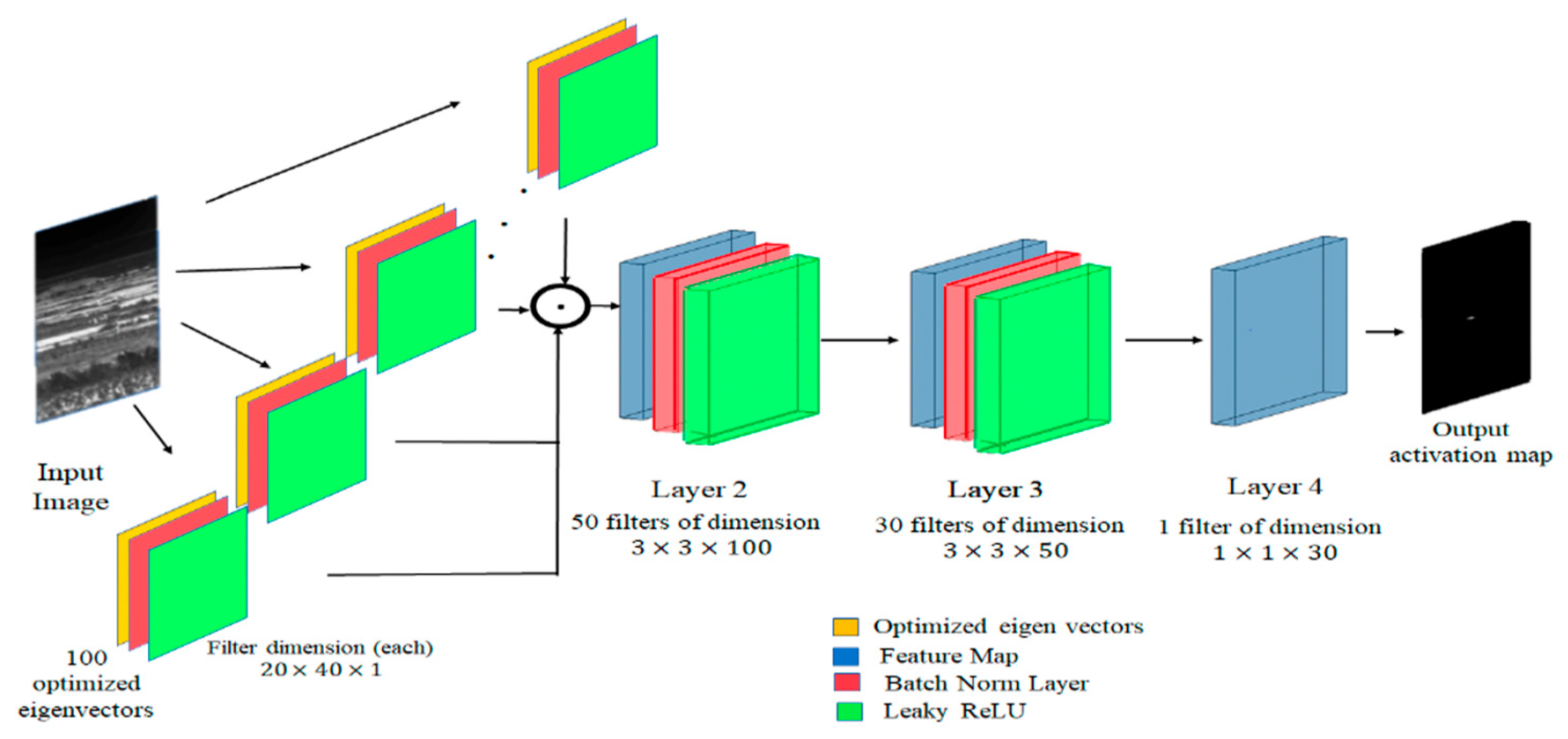 This is the well-known Raleigh quotient, which is maximized by choosing to be the eigenvectors of . The eigenvectors with larger eigenvalues favor targets while the ones with smaller eigenvalues favor clutter. Thus, the dominant eigenvectors are chosen to be the filters in the first layer of the TCRNet.