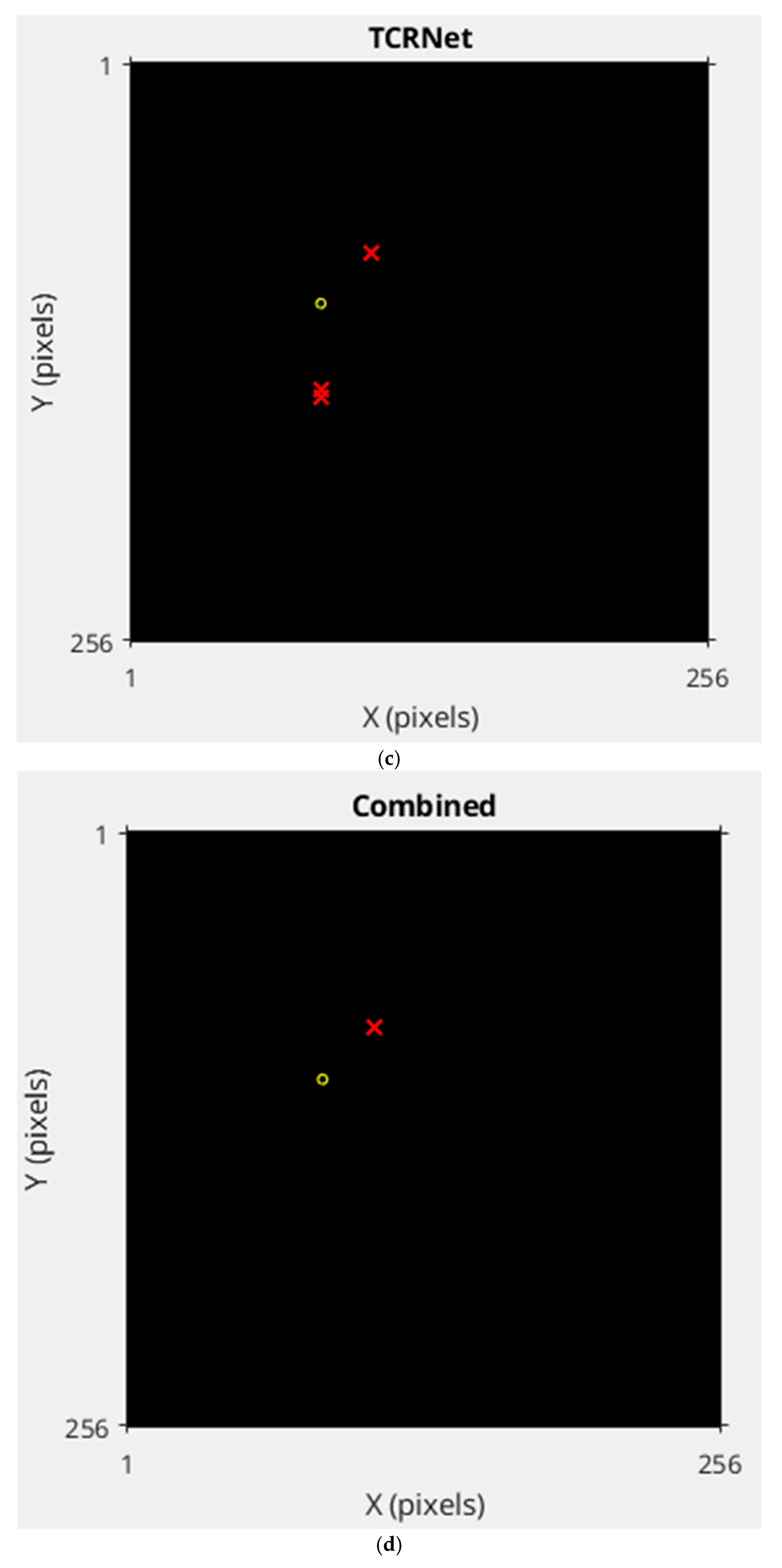 In this section, we discuss the performance of the TRX–TCRNet model and compare it against various other models (cited as references), while emphasizing its efficiency and accuracy. All networks are trained as described in their respective references. Detection is treated as a two-class problem, where a prediction is considered a true positive if its location is within five pixels of the ground-truth center (regardless of classification output). Otherwise, all other detections are treated as false positives.