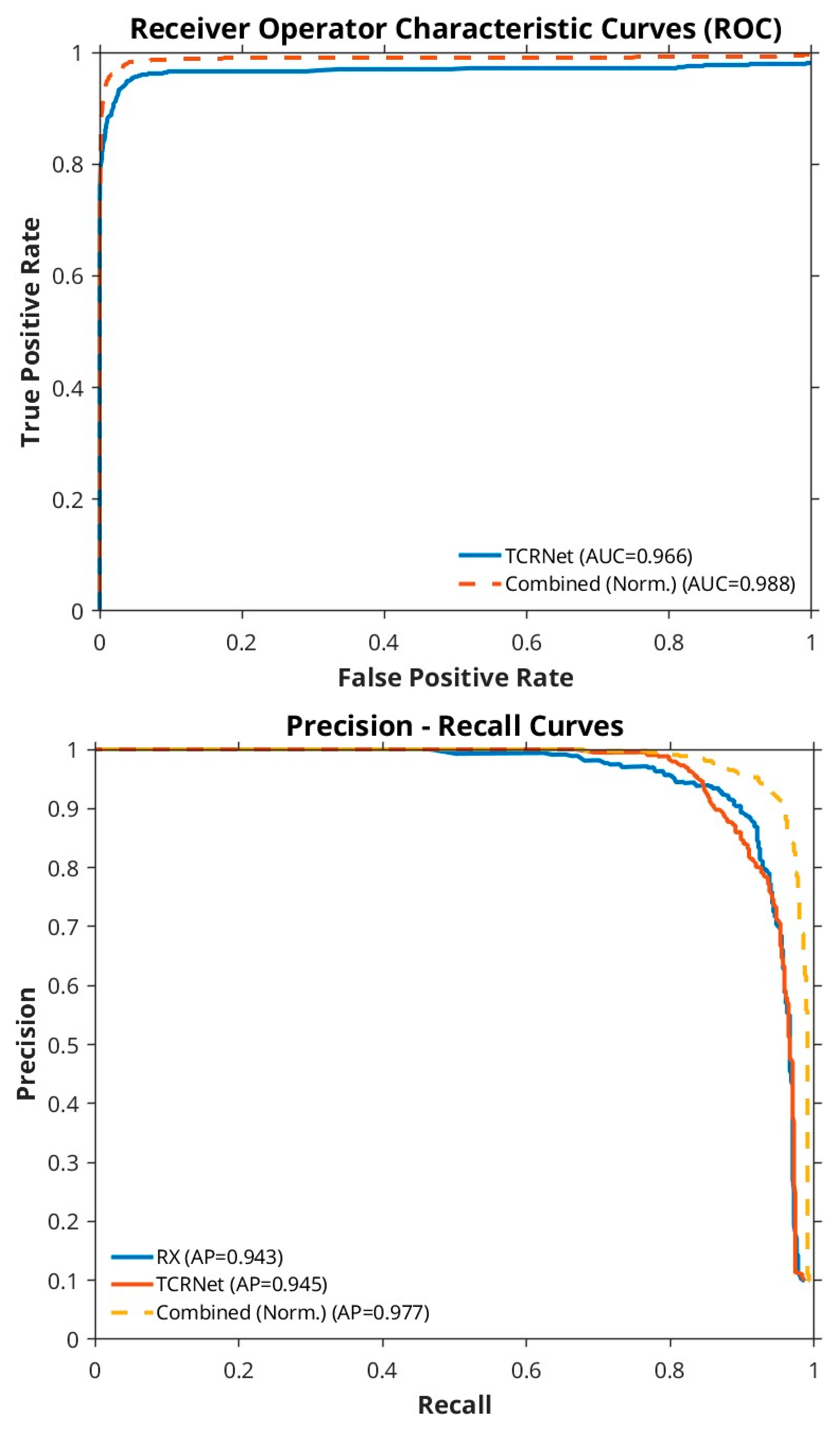 Figure 6 compare the performance contributions of the TRX detector (blue curve), the TCRNet (red curve) and the combined TRX–TCRNet framework (dashed yellow curve). The dashed yellow curve consistently envelopes the other two, highlighting the improvement gained by using these algorithms in parallel.