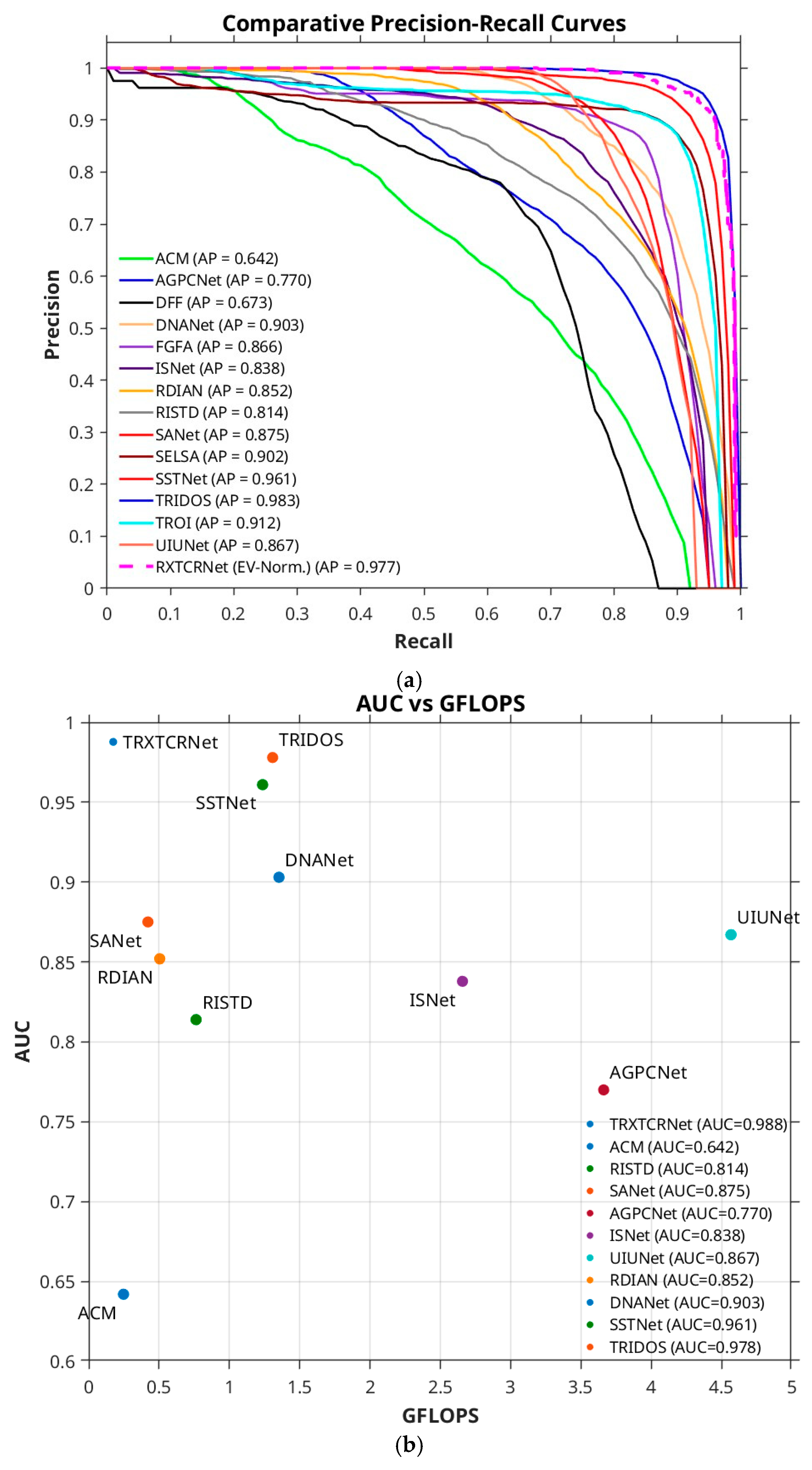 50 and F1 score), computational cost (FLOPs), model size (parameters), and overall performance (AUC). Importantly, the comparison spans both single-frame algorithms (e.g., ACM, DNANet) and multi-frame approaches (e.g., SSTNet, TRIDOS, TRX–TCRNet), thereby emphasizing how temporal integration can improve detection while also introducing computational trade-offs. The following observations highlight TRX–TCRNet’s strengths.