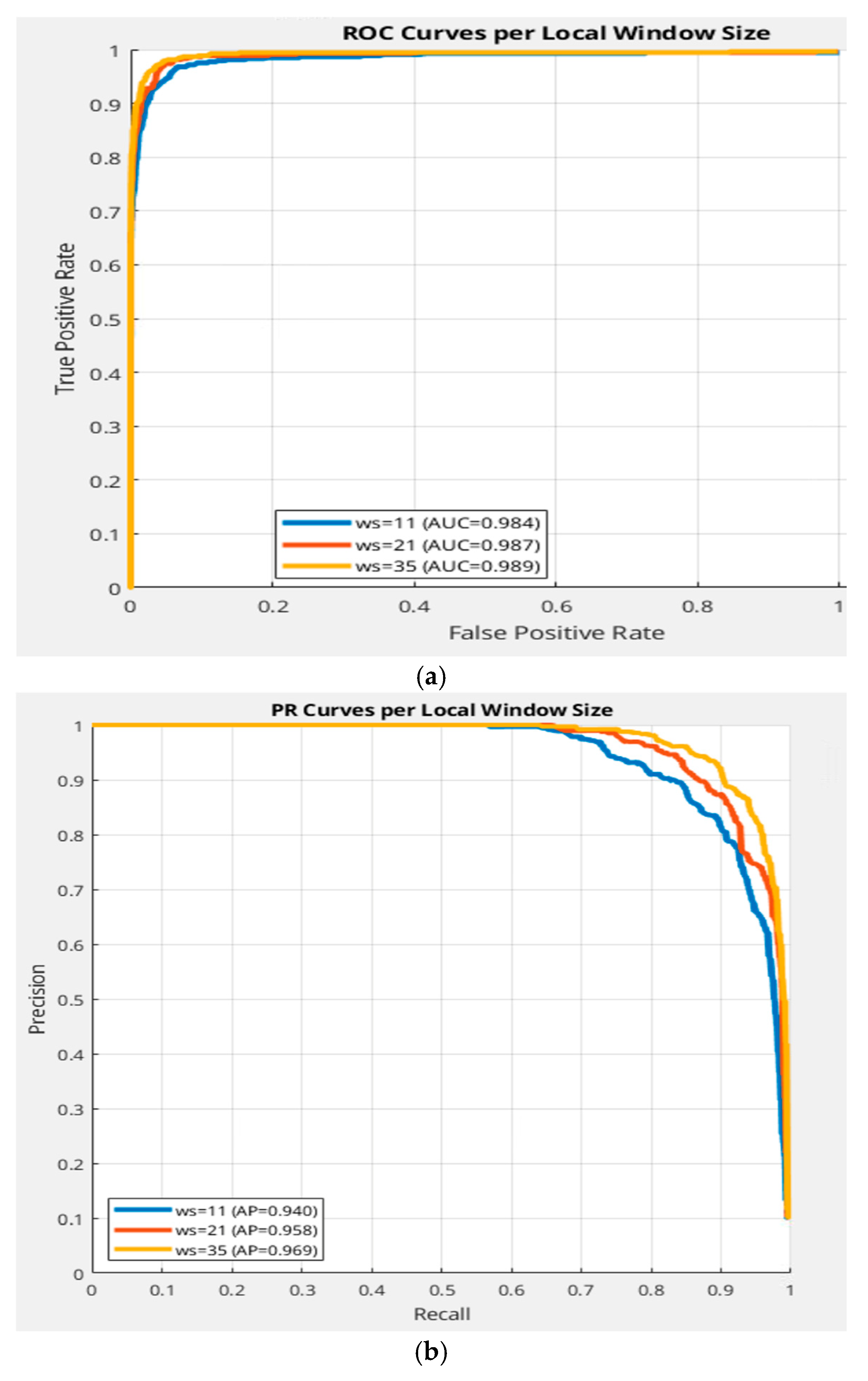 Section 5.2). Furthermore, detections within 5 pixels of ground truth are treated as true positives while all others are false alarms. Ablation studies are performed to evaluate local TRX window sizes (e.g., 11, 21, 35) for robustness.