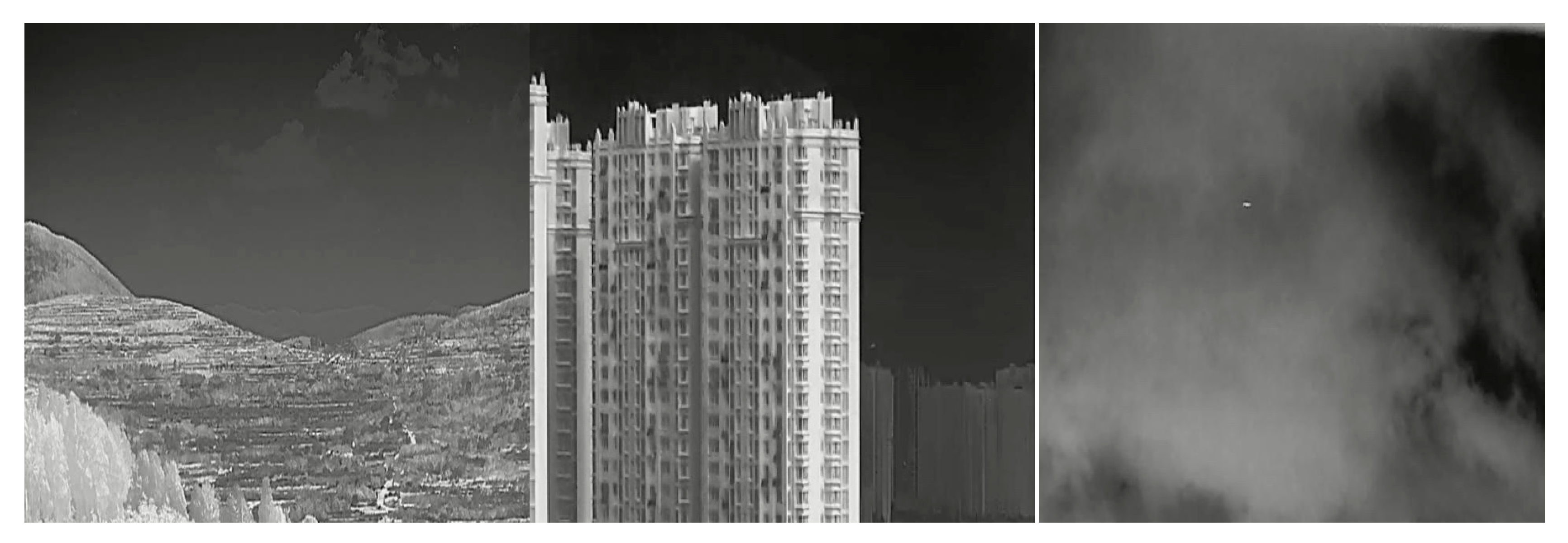 Table 1 shows the specifications of the dataset. This dataset comprises real mid-wave infrared video sequences captured using a cooled 3–5 µm camera with 256 × 256 resolution, 3.0° × 3.0° FOV, and up to 100 Hz frame rate. It includes 22 data segments, 30 trajectories, and 16,177 frames containing 16,944 annotated targets. The UAVs are small fixed-wing aircraft appearing as 1–10-pixel targets at low altitude. The dataset spans diverse conditions—day/night cycles, sunny and cloudy weather, and backgrounds including sky, vegetation, suburban areas, terrain, and man-made structures—providing a challenging benchmark for dim-small target detection.