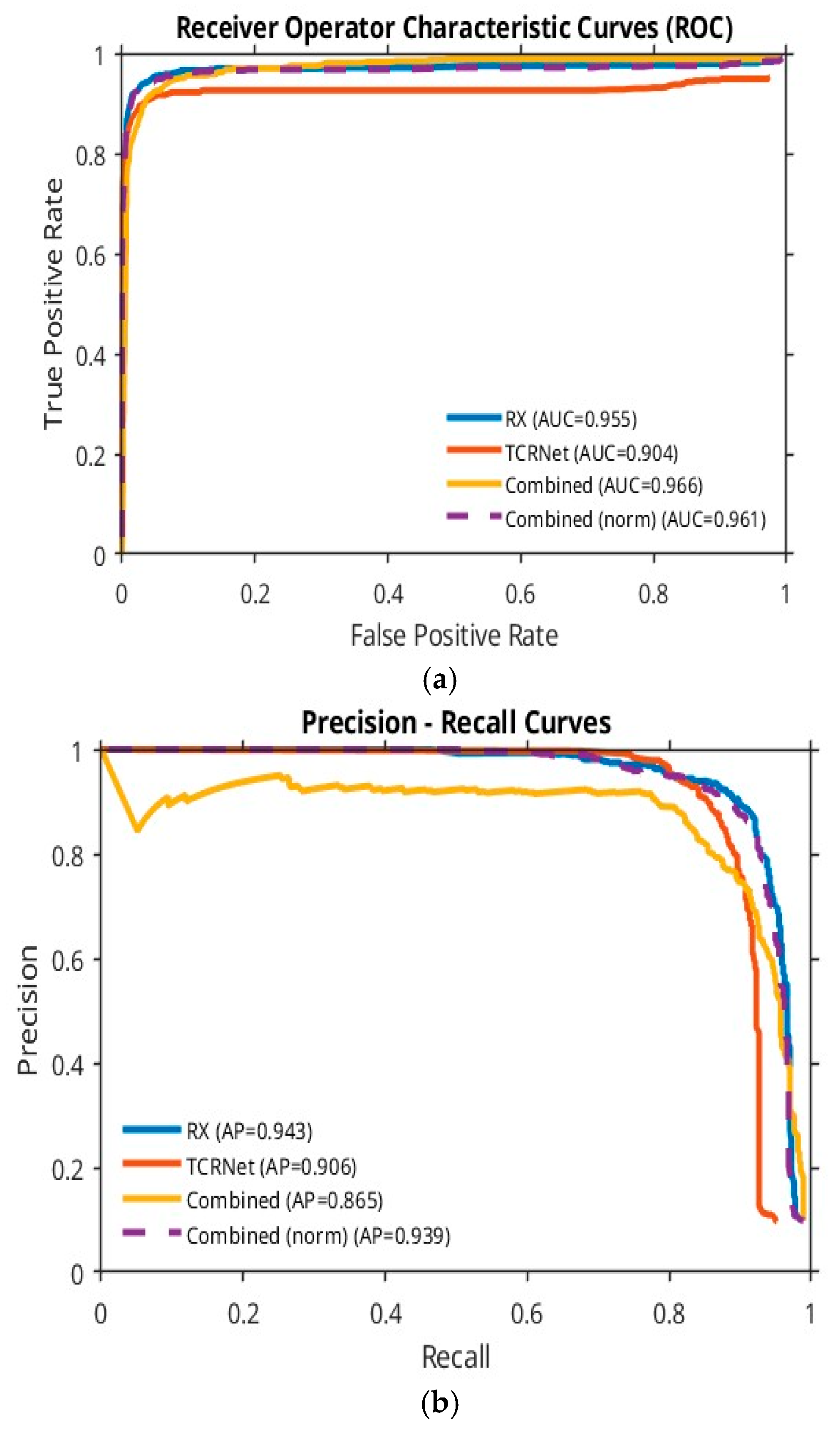 Figure 7b illustrates the comparison of different methods in terms of both performance and computational complexity by plotting their AUC versus computational cost (GFLOPs). We note that the TRX–TCRNet achieves one of the highest performances for the lowest computational cost, thereby making it an attractive choice for use in edge operations and in systems with limited computing and power resources [