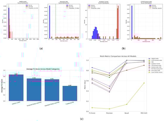 HIPER-CHAD achieved an F1-Score of 0.8571, reflecting a strong balance between accurately identifying true anomalies (Recall = 1.0000) and effectively minimizing false positives (Precision = 0.7500). HIPER-CHAD distinguished itself as the only model to attain a perfect recall rate of 100%, while also preserving high precision. The model achieved a ROC-AUC score of 0.9983, thereby affirming its exceptional proficiency in accurately ranking anomalies. The second-best model, the LSTM Autoencoder, achieved an F1-Score of 0.8095, representing a 5.9% relative improvement for HIPER-CHAD. The disparity in performance becomes even more evident when examining the average F1-Score across the model categories, as illustrated in Figure 2. HIPER-CHAD, the sole representative of the hybrid category, outperformed all other categories, affirming the effectiveness of the proposed two-stage method. The temporal models achieved an average F1-Score of 0.7286, which is 38.3% higher than the 0.5577 score of non-temporal models as shown in Figure 2c, underscoring the significance of temporal modeling for this data type. This quantitative advantage is further explained through a qualitative analysis of the distribution of anomaly scores of the four top models with the highest F1-score based on Table 1 shown in Figure 2a,b. As shown in the comparative histograms, traditional models like Isolation Forest exhibit significant distributional overlap between normal and anomalous samples, resulting in a higher rate of false alarms. In contrast, HIPER-CHAD showed well-separated classes. The proposed residual-based scoring mechanism ensures that normal data points are mapped to a highly compact distribution concentrated near zero, creating a clear and decisive margin from the anomalous events. This distinct bimodality facilitates the determination of a robust decision threshold, thereby minimizing classification ambiguity and directly explaining the model’s superior precision and recall balance compared to the more diffuse score distributions observed in baseline architectures.