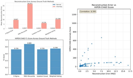 This separability is further quantified in the bar charts of Figure 4, which highlight a massive disparity in mean reconstruction errors. Specifically, under the 99th Percentile ground truth, the mean error for anomalies () is orders of magnitude higher than that of normal data (). This sharp signal-to-noise ratio confirms that the model establishes a clear decision boundary between normal and abnormal events. Furthermore, the correlation scatter plot between HIPER-CHAD anomaly scores and reconstruction errors reinforces the efficacy of the hybrid approach. The moderate correlation () suggests that the metrics are complementary rather than redundant. While higher anomaly scores generally align with elevated reconstruction errors (MSE), the presence of data points with moderate MSE but high HIPER-CHAD scores indicates that the inclusion of the KL-divergence term successfully captures probabilistic anomalies such as subtle distribution shifts that simple reconstruction error might overlook.