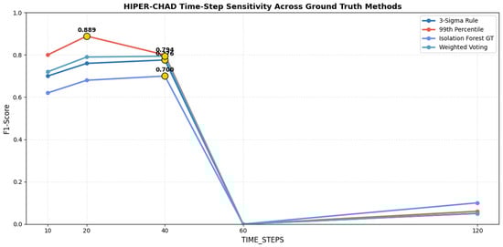 The selection of time-step window length is pivotal in influencing the sensitivity and stability of the detection model. The Time-Step Sensitivity Analysis is designed to systematically assess the impact of varying the window length parameter on the performance of the model workflow when applied to multivariate time-series sensor data. The analysis reveals a distinct non-linear relationship between the time-step window and performance. Visual evidence from the aggregated F1-scores in Figure 5 demonstrates that HIPER-CHAD consistently achieves its strongest performance within the 10–40 time-step range, where average F1-scores remain high at 0.730, 0.764, and 0.768, respectively. The observed stability in high performance indicates that temporal windows of 100–400 min are sufficient to capture essential temporal dependencies, while avoiding the introduction of extraneous noise. In contrast, performance collapses at longer windows: at 60 time steps, the model fails entirely (F1 = 0.000), and at 120 time steps performance remains negligible (F1 = 0.054), illustrating a catastrophic loss of sensitivity when the sequence length becomes excessively large. Complementary evidence from the right panel of the Figure 5 shows that statistical ground truth definitions, particularly the 99th Percentile (average F1 = 0.519) and Weighted Voting (0.464), yield consistently stronger evaluations than Isolation Forest (0.419), reinforcing that the stability of the model’s performance is tightly coupled with label reliability. Together, these results validate that the optimal temporal window for HIPER-CHAD lies between 10 and 40 time steps, with 20–40 steps offering the most reliable balance between temporal context and detection stability.