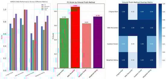 The comprehensive comparison across different ground truth methods is further reinforced by Figure 7, which expands the evaluation of HIPER-CHAD’s performance in multivariate anomaly detection. It visualizes numerical metrics under each ground truth scenario using bar charts that facilitate direct comparison. The heat map of the ground truth method overlays provides quantitative evidence of label consistency. It shows a high level of agreement (similarity index close to 1.0) between statistical methods such as the 3-Sigma Rule and the 99th Percentile, indicating a strong consensus on what is considered a true anomaly. The overlap matrix yields a 1.0 similarity between the 99th Percentile method and all other ground truth definitions. It might be due to class cardinality based on Figure 2: the 99th percentile produces the fewest number of anomaly labels (36 anomalies), all of which are also detected by the larger anomaly sets from the 3-Sigma Rule (114 anomalies), Isolation Forest (179 anomalies), and Weighted Voting (107 anomalies). Therefore, the overlap is not an artefact, but rather a natural result of a conservative labeling scheme, in which the detected anomalies form a strict subset of other strategies.