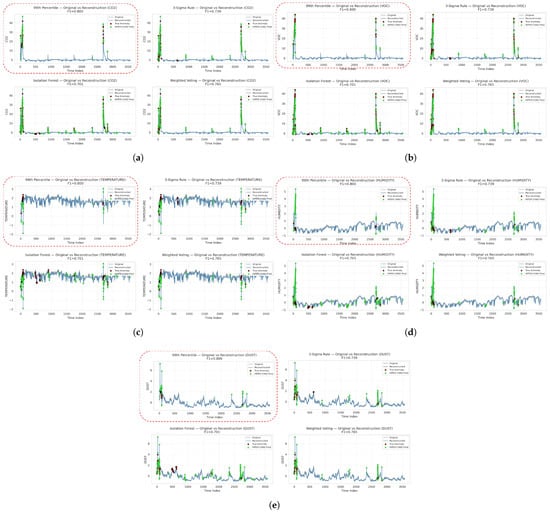 The visualization of original vs reconstruction of indoor enviromental multivariate time-series data and detection consistency across ground truth methods overtime. (a) signal overtime. (b) VOC signal overtime. (c) Temperature signal overtime. (d) Humidity signal overtime. (e) Dust concentration overtime.