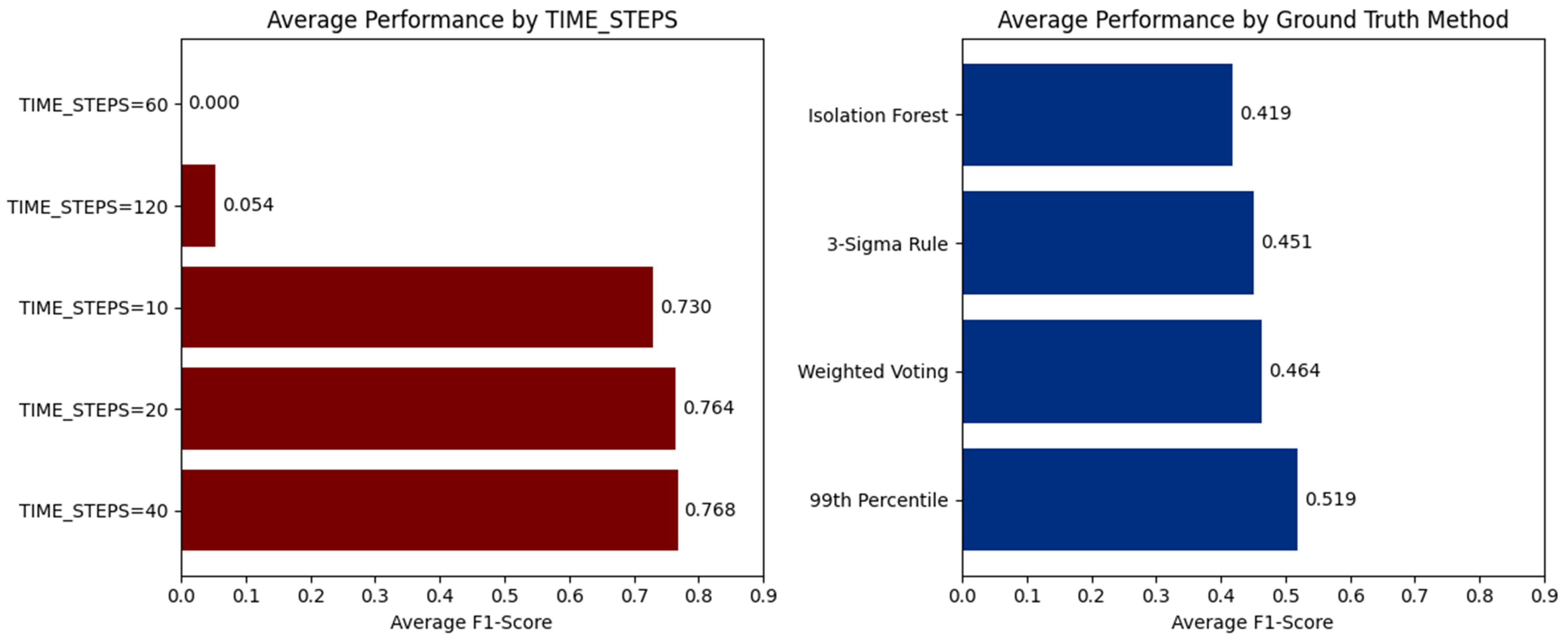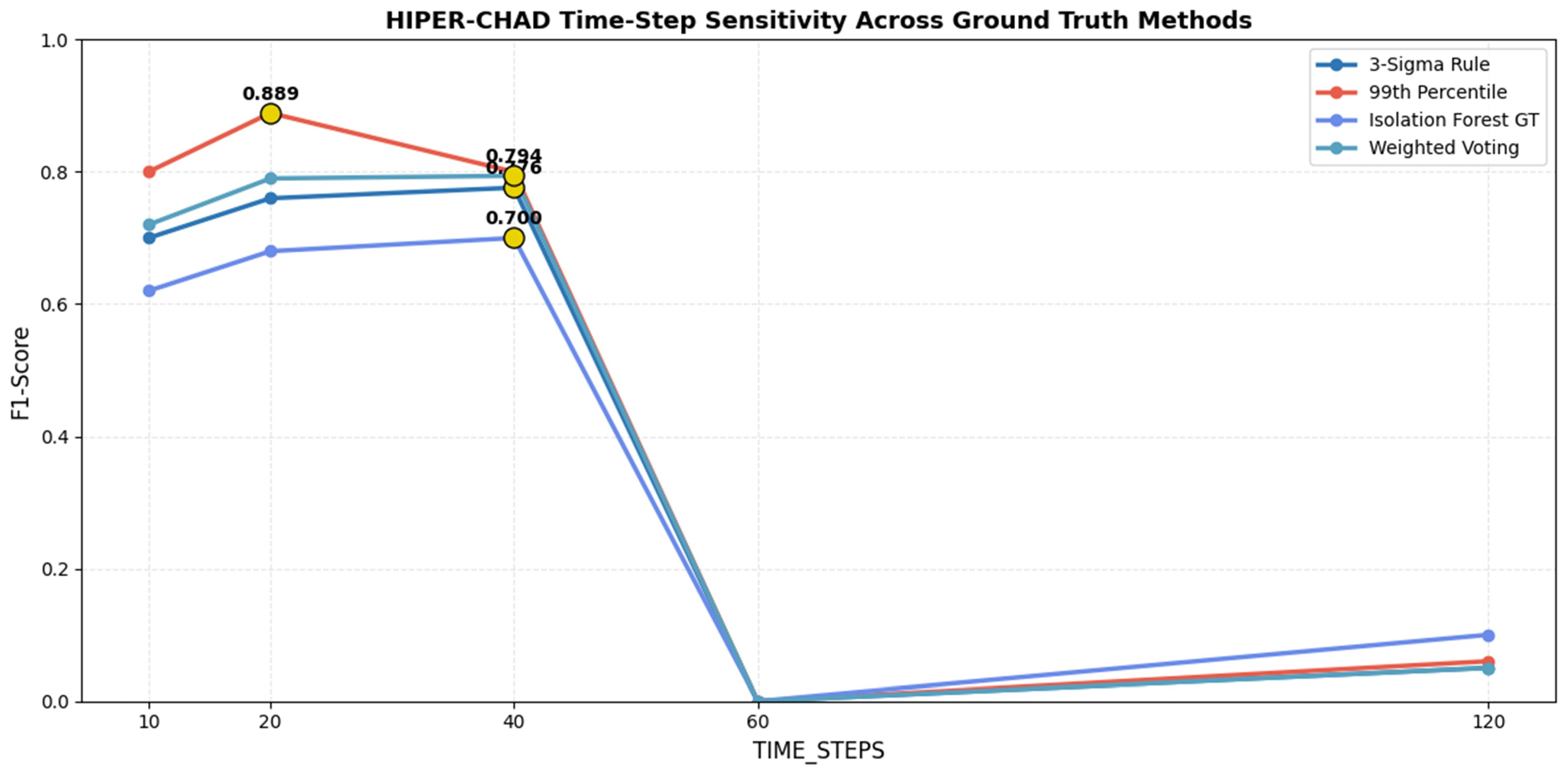 Figure 5 shows that statistical ground truth definitions, particularly the 99th Percentile (average F1 = 0.519) and Weighted Voting (0.464), yield consistently stronger evaluations than Isolation Forest (0.419), reinforcing that the stability of the model’s performance is tightly coupled with label reliability. Together, these results validate that the optimal temporal window for HIPER-CHAD lies between 10 and 40 time steps, with 20–40 steps offering the most reliable balance between temporal context and detection stability.