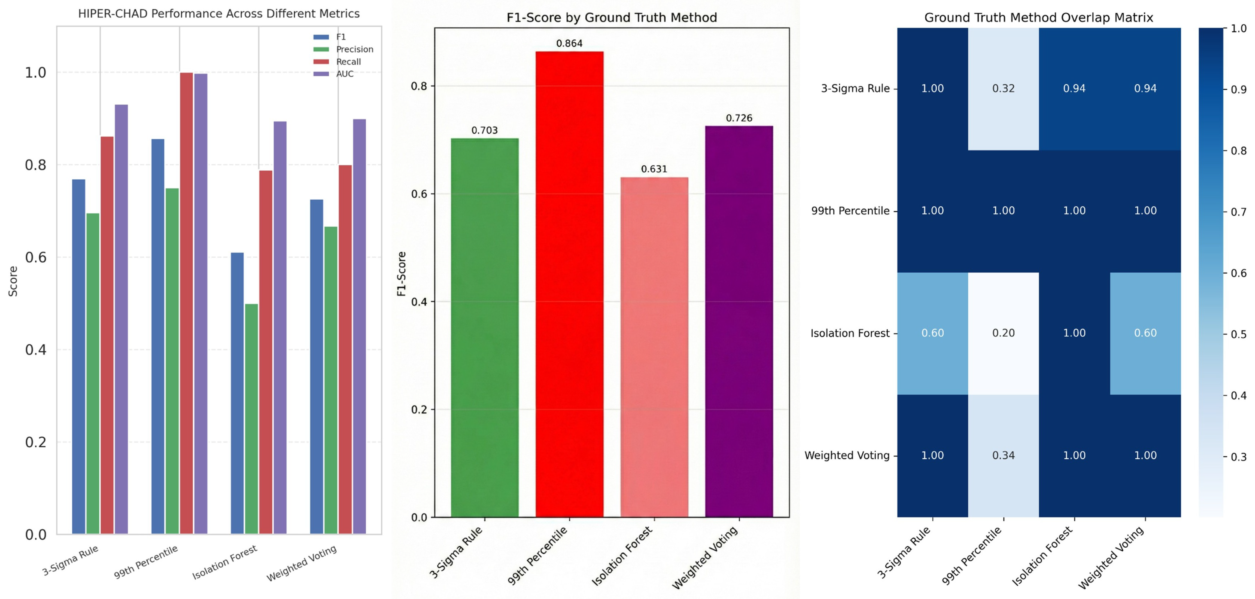 Figure 7, which expands the evaluation of HIPER-CHAD’s performance in multivariate anomaly detection. It visualizes numerical metrics under each ground truth scenario using bar charts that facilitate direct comparison. The heat map of the ground truth method overlays provides quantitative evidence of label consistency. It shows a high level of agreement (similarity index close to 1.0) between statistical methods such as the 3-Sigma Rule and the 99th Percentile, indicating a strong consensus on what is considered a true anomaly. The overlap matrix yields a 1.0 similarity between the 99th Percentile method and all other ground truth definitions. It might be due to class cardinality based on