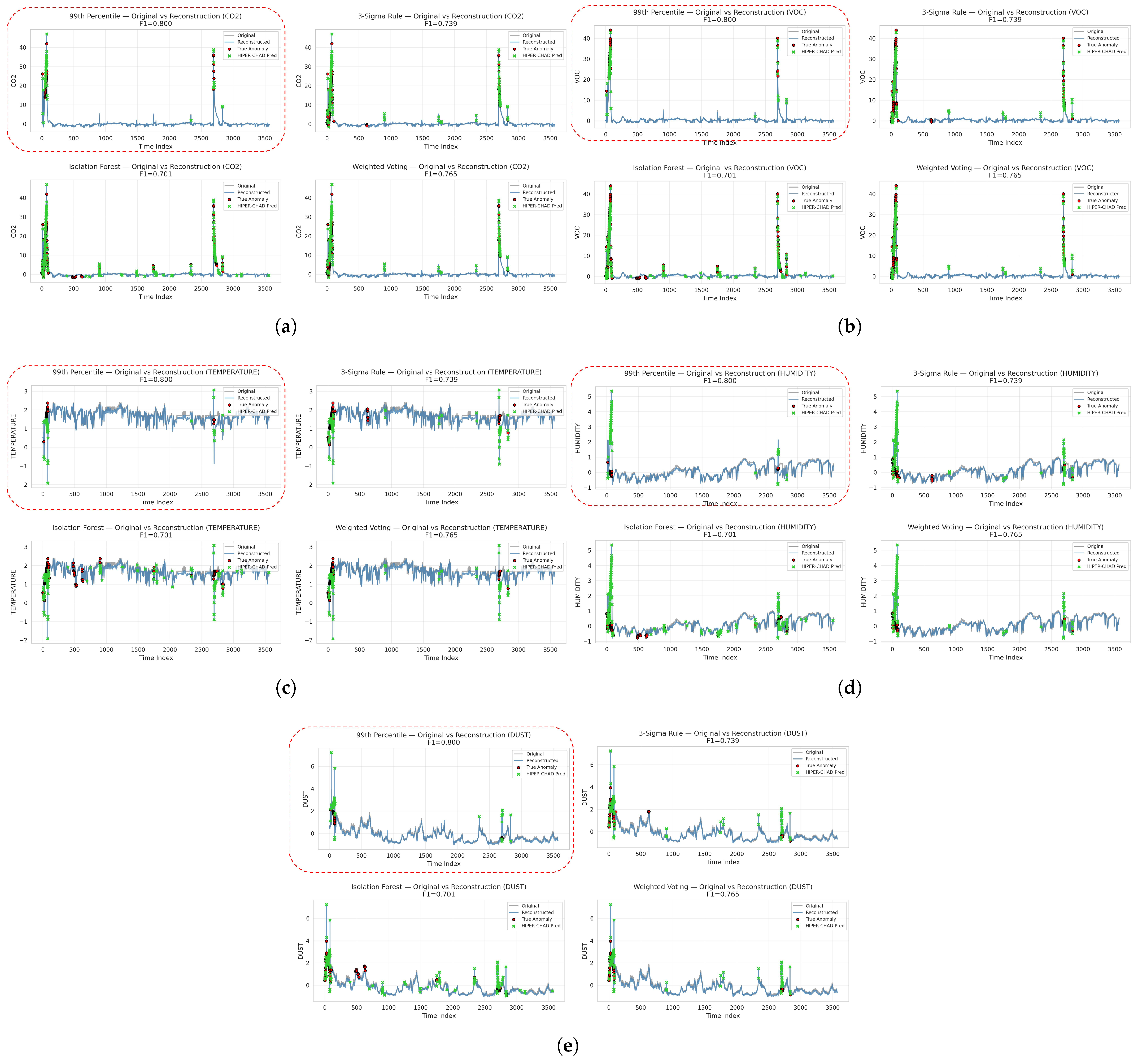 , VOC, temperature, humidity, and dust signals, and HIPER-CHAD accurately aligns its predictions with these dominant deviations. On the other hand, Isolation Forest produces labels that are scattered across many minor fluctuations, but HIPER-CHAD only responds selectively to physically meaningful peaks, demonstrating its ability to suppress noise-induced detections. This trend remains consistent across all sensor modes: even when temperature and humidity anomalies appear as smaller amplitude deviations than other variables, HIPER-CHAD continues to track the structural shifts present in the reconstructed signal rather than the raw number of outliers. Similarly, although Weighted Voting provides a more balanced reference, HIPER-CHAD still converges closely to the actual anomaly clusters rather than sporadic spikes, indicating that the model’s detection behaviour is more influenced by learned temporal patterns than thresholds triggered by artefacts.